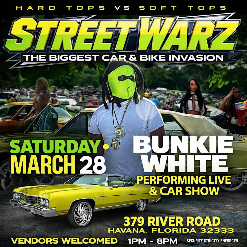 by admin27Feb Bunkie White Carshow & Concert at 379 River Rd – Havana, FL Bunkie White Carshow & Concert at 379 River Rd – Havana, FL 1 1 people viewed this event. Bunkie White Car Show & Concert Get ready for a high-energy day you won’t forget at the Bunkie White Car Show & Concert! Pull up Tickets-RSVP Link Date And Time Saturday, March 28th, 2026 01:00 PM (PST) Venue 379 River Rd Location 379 River Road, Havana, FL 32333 Event Types Concert or PerformanceMusic Event Category Florida Share With Friends Facebook Twitter Linkedin Xing Pinterest Share This Post: