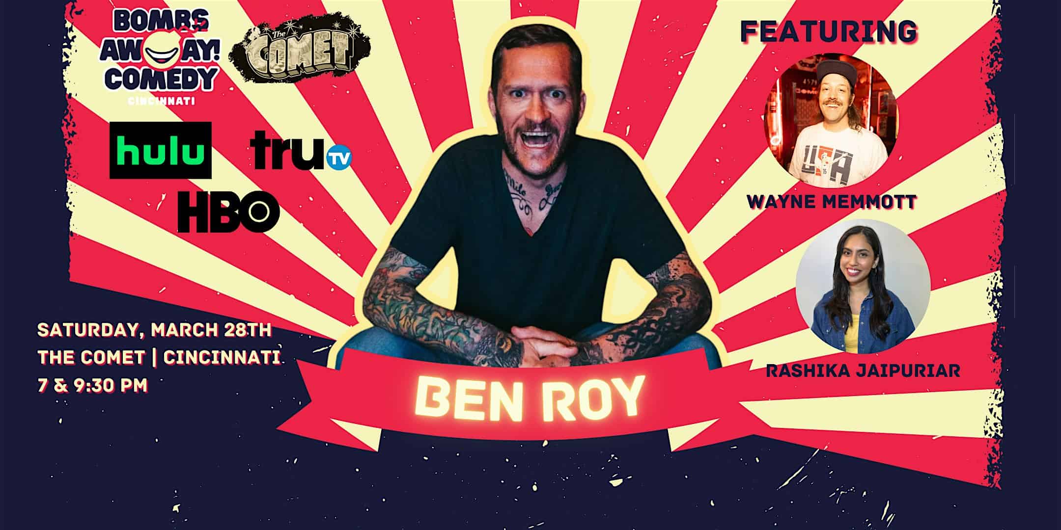 by admin14Feb Comedy At The Comet | BEN ROY at Bombs Away! Comedy at the Comet – Cincinnati, OH Comedy At The Comet | BEN ROY at Bombs Away! Comedy at the Comet – Cincinnati, OH 1 1 people viewed this event. Comedian Ben Roy Performs Live at Comedy @ the Comet on Saturday, March 28th @ 7 & 9:30 PM Tickets-RSVP Link Date And Time Saturday, March 28th, 2026 11:00 PM (PST) Venue Bombs Away! Comedy at the Comet Location 4579 Hamilton Avenue, Cincinnati, OH 45223 Event Types Concert or PerformancePerforming & Visual Arts Event Category CincinnatiOhio Share With Friends Facebook Twitter Linkedin Xing Pinterest Share This Post: