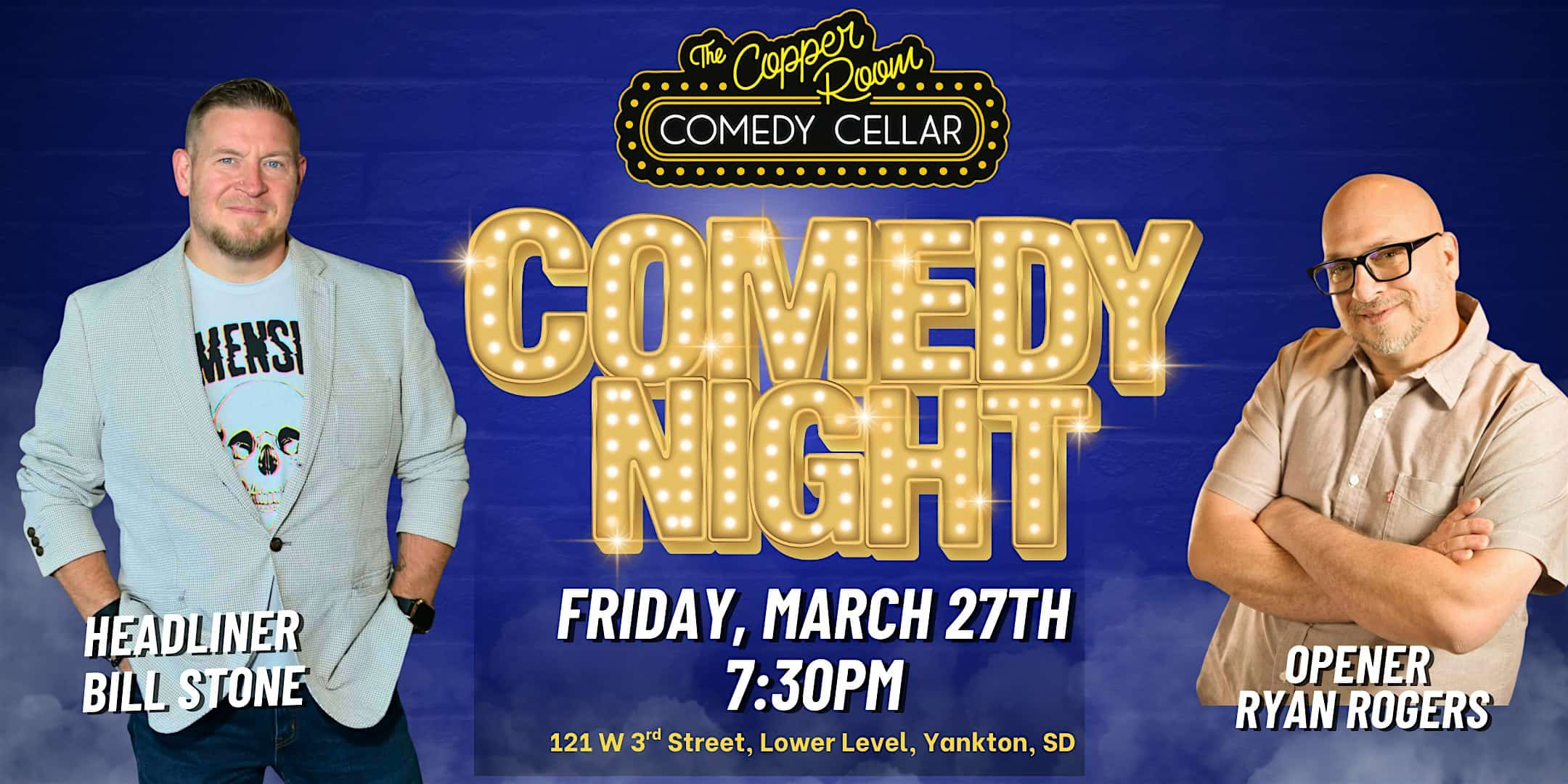 by admin14Feb Comedy Night with Bill Stone & Ryan Rogers at Copper Room Comedy Cellar – Yankton, SD Comedy Night with Bill Stone & Ryan Rogers at Copper Room Comedy Cellar – Yankton, SD 1 1 people viewed this event. Join us for a night of laughs with Bill Stone & Ryan Rogers! Tickets-RSVP Link Date And Time Saturday, March 28th, 2026 12:00 AM (PST) Venue Copper Room Comedy Cellar Location 121 West 3rd Street, Yankton, SD 57078 Event Types Concert or PerformancePerforming & Visual Arts Event Category South Dakota Share With Friends Facebook Twitter Linkedin Xing Pinterest Share This Post: