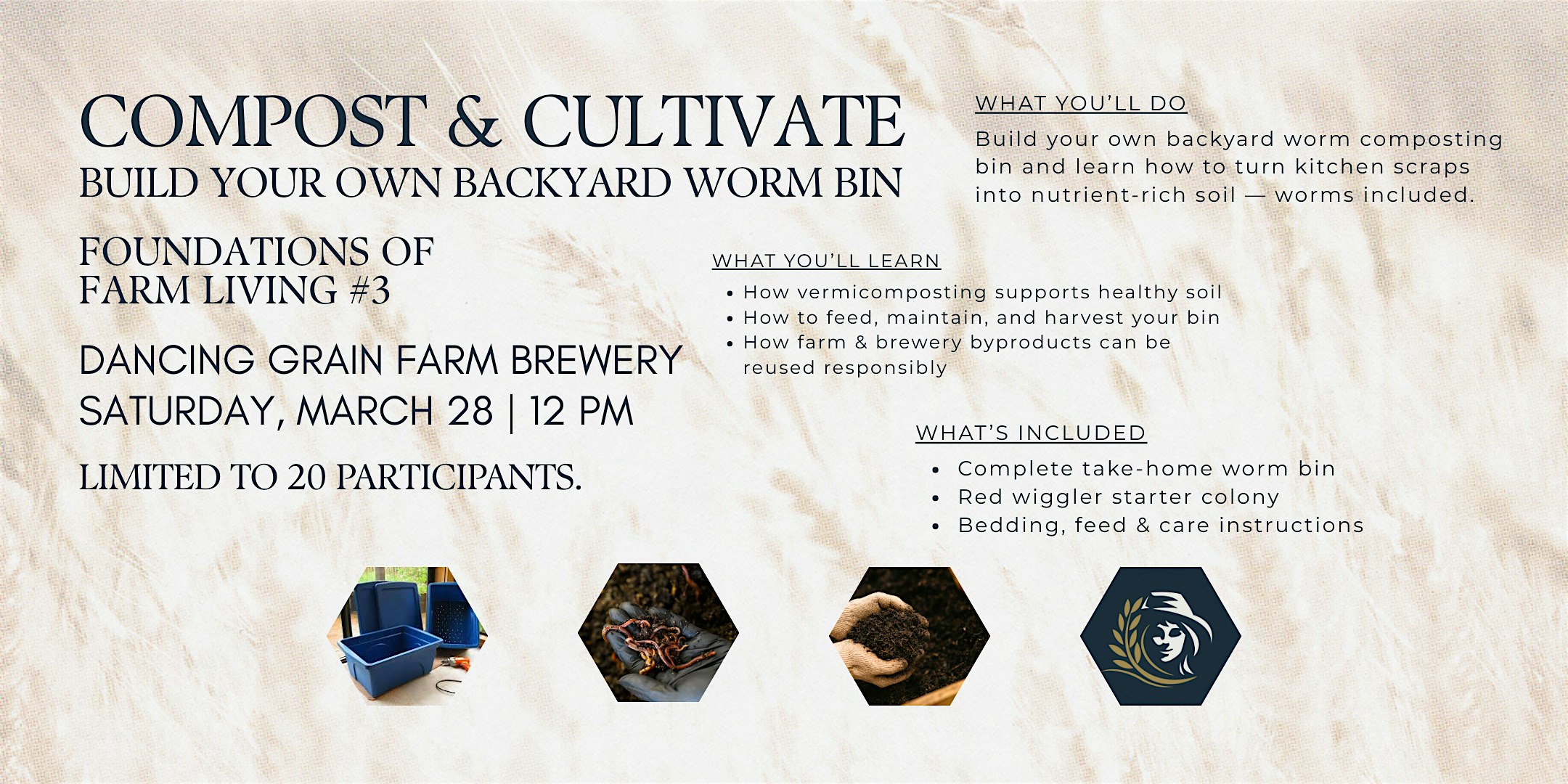 by admin27Feb COMPOST & CULTIVATE at Dancing Grain Farm Brewery – Gansevoort, NY COMPOST & CULTIVATE at Dancing Grain Farm Brewery – Gansevoort, NY 2 2 people viewed this event. Dig into soil biology and vermicomposting in this hands-on workshop where you’ll build a take-home worm bin. Tickets-RSVP Link Date And Time Saturday, March 28th, 2026 12:00 PM (PST) Venue Dancing Grain Farm Brewery Location 180 Old West Road, Gansevoort, NY 12831 Event Types Food & Drink Event Category New York Share With Friends Facebook Twitter Linkedin Xing Pinterest Share This Post: