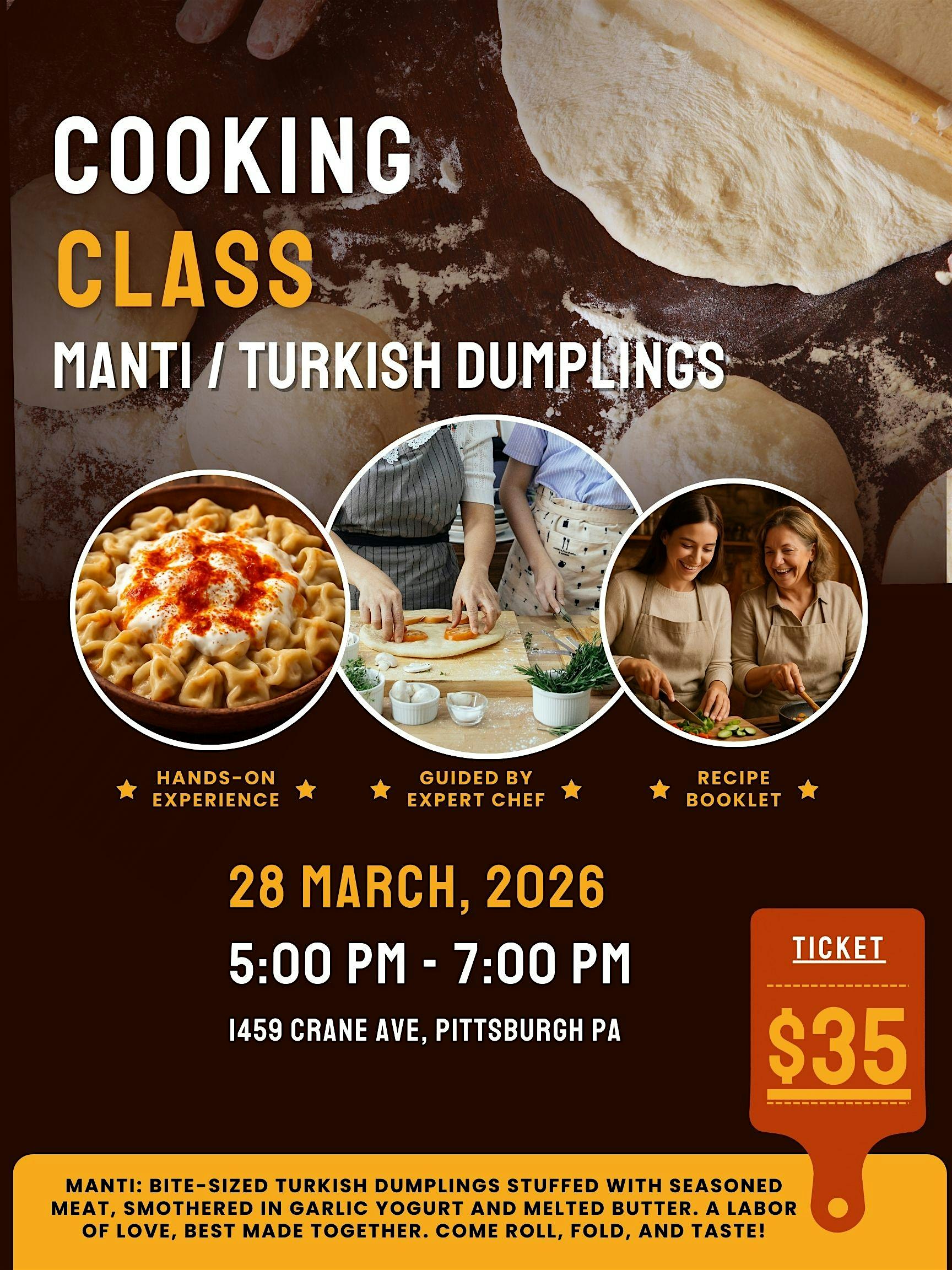 by admin24Feb Cooking Class Manti / Turkish Dumplings at Turkish Cultural Center Pittsburgh – Pittsburgh, PA Cooking Class Manti / Turkish Dumplings at Turkish Cultural Center Pittsburgh – Pittsburgh, PA 2 2 people viewed this event. El yapımı mantı yapmayı öğren, Türk mutfağının vazgeçilmez lezzetini birlikte keşfedelim! Tickets-RSVP Link Date And Time Saturday, March 28th, 2026 05:00 PM (PST) Venue Turkish Cultural Center Pittsburgh Location 1459 Crane Avenue, Pittsburgh, PA 15220 Event Types Food & Drink Event Category PennsylvaniaPittsburgh Share With Friends Facebook Twitter Linkedin Xing Pinterest Share This Post: