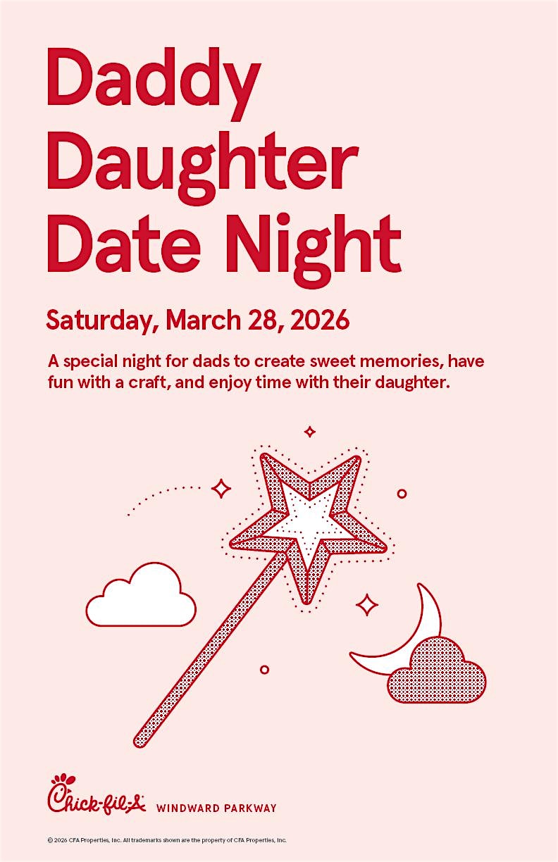 by admin27Feb Daddy Daughter Fairy Date Night Windward Parkway at 5180 Windward Pkwy – Alpharetta, GA Daddy Daughter Fairy Date Night Windward Parkway at 5180 Windward Pkwy – Alpharetta, GA 1 1 people viewed this event. Join us for a night of great food, fairy crafts, photo opportunities, and a special appearance from the Chick-fil-A cow. Tickets-RSVP Link Date And Time Saturday, March 28th, 2026 @ 04:00 PM Location 5180 Windward Parkway, Alpharetta, GA 30004 Event Types Party or Social Gathering Event Category AtlantaGeorgia Share With Friends Facebook Twitter Linkedin Xing Pinterest Share This Post: