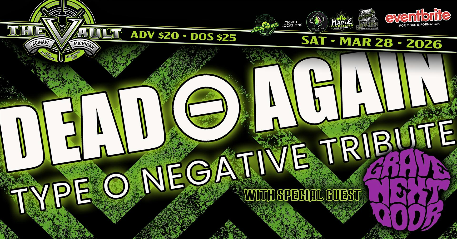 by admin27Feb DEAD AGAIN “Type O Negative Tribute” wsg/ Grave Next Door at The VAULT – Saginaw, MI DEAD AGAIN “Type O Negative Tribute” wsg/ Grave Next Door at The VAULT – Saginaw, MI 1 1 people viewed this event. DEAD AGAIN “Type O Negative Tribute” wsg/ Grave Next Door!! Tickets-RSVP Link Date And Time Saturday, March 28th, 2026 07:00 PM (PST) Venue The VAULT Location 110 Florence Street, Saginaw, MI 48602 Event Types Concert or PerformanceMusic Event Category Michigan Share With Friends Facebook Twitter Linkedin Xing Pinterest Share This Post: