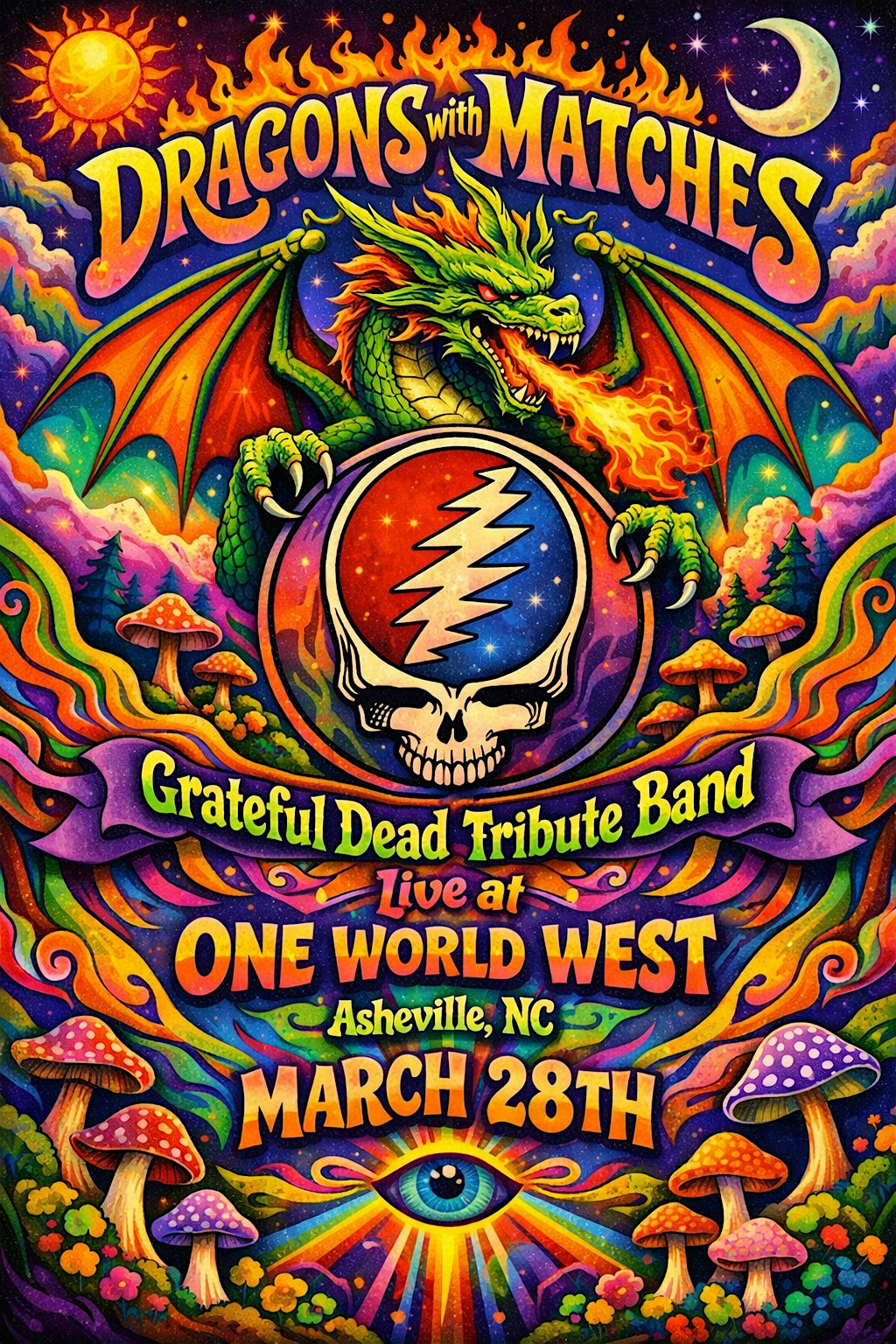 by admin27Feb Dragons with Matches at One World Brewing West – Asheville, NC Dragons with Matches at One World Brewing West – Asheville, NC 1 1 people viewed this event. Come out to see Wilmington based Grateful Dead Tribute Band @ One World West! Tickets-RSVP Link Date And Time Saturday, March 28th, 2026 09:00 PM (PST) Venue One World Brewing West Location 520 Haywood Road, Asheville, NC 28806 Event Types Concert or PerformanceMusic Event Category North Carolina Share With Friends Facebook Twitter Linkedin Xing Pinterest Share This Post:
