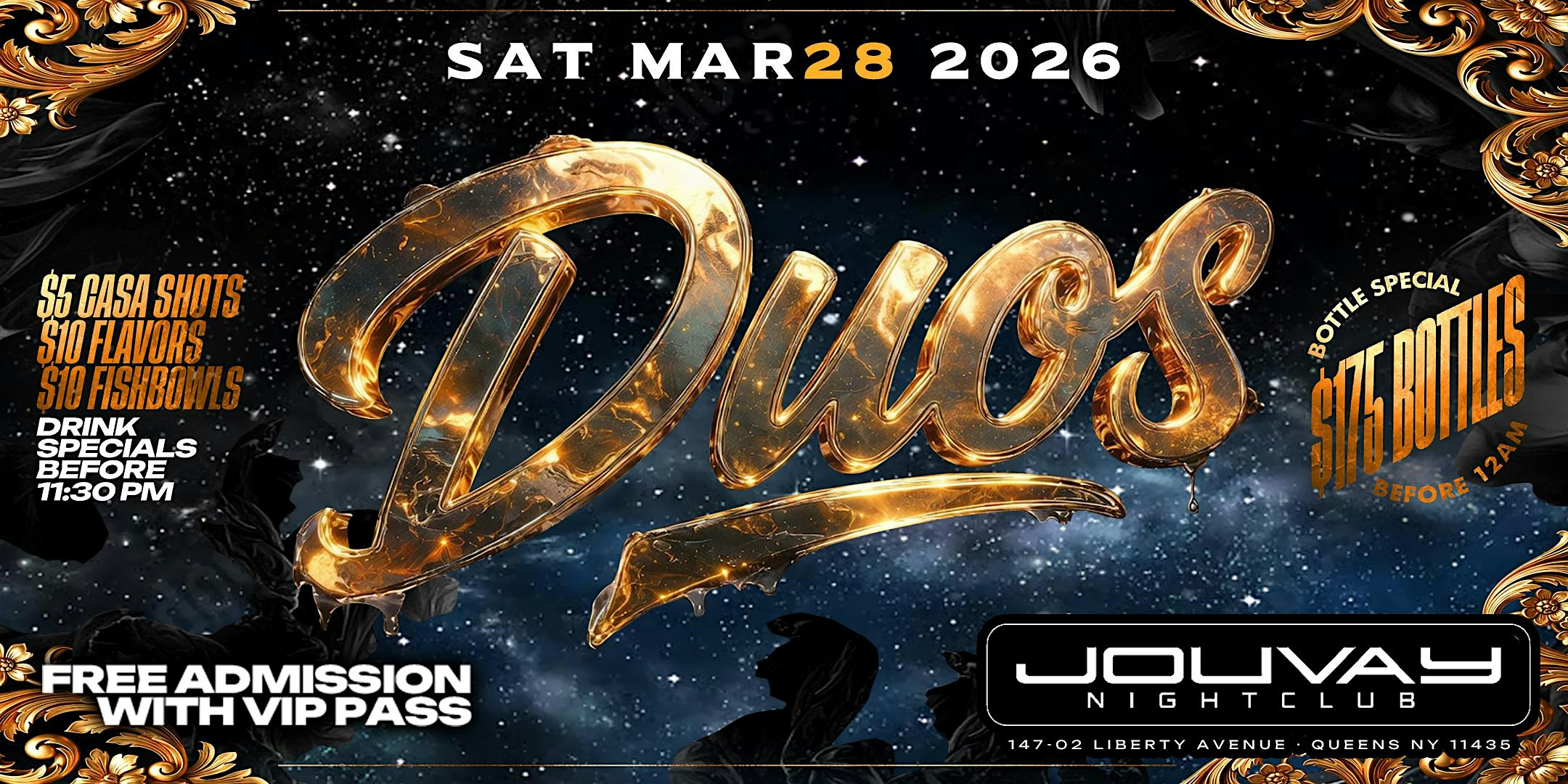by admin24Feb DUOS 2026 #VIPT17 at Jouvay Night Club – Queens, NY DUOS 2026 #VIPT17 at Jouvay Night Club – Queens, NY 1 1 people viewed this event. VIP TREATMENT: DUOS EDITION. DJ ACE’S 17TH ANNUAL BDAY PARTY Tickets-RSVP Link Date And Time Saturday, March 28th, 2026 10:00 PM (PST) Venue Jouvay Night Club Location 147-02 Liberty Avenue, Queens, NY 11435 Event Types Music Event Category New YorkNew York City Share With Friends Facebook Twitter Linkedin Xing Pinterest Share This Post: