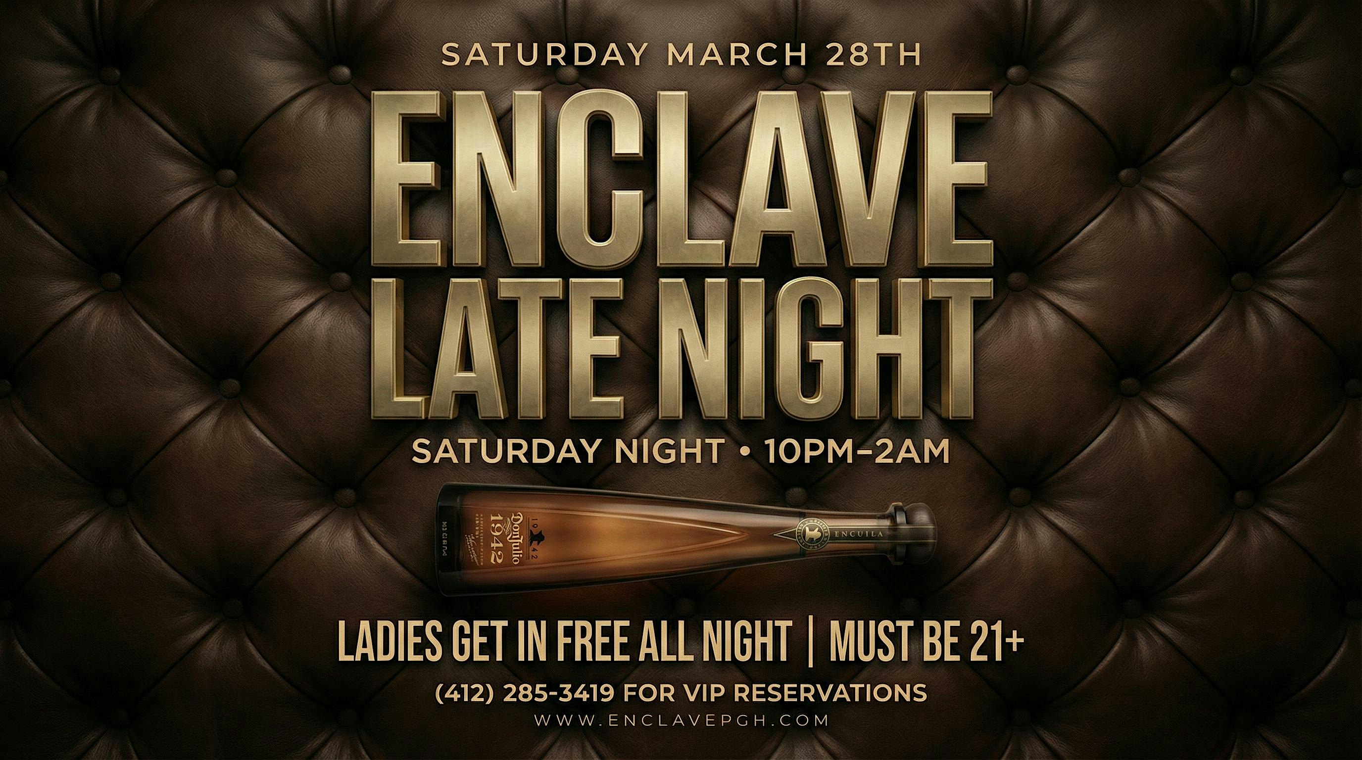 by admin24Feb Enclave | Late Night | Saturday Night at Enclave – Pittsburgh, PA Enclave | Late Night | Saturday Night at Enclave – Pittsburgh, PA 3 3 people viewed this event. Pittsburgh’s #1 Nightclub presents: Enclave | Late Night | Saturday Night with @QueensOfEnclave! Experience the REAL nightlife in Pittsburgh Tickets-RSVP Link Date And Time Saturday, March 28th, 2026 10:00 PM (PST) Venue Enclave Location 1602 East Carson Street, Pittsburgh, PA 15203 Event Types MusicParty or Social Gathering Event Category PennsylvaniaPittsburgh Share With Friends Facebook Twitter Linkedin Xing Pinterest Share This Post: