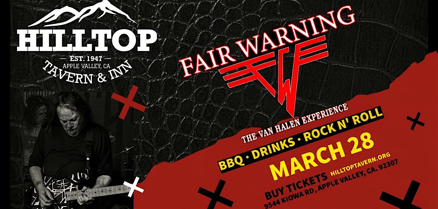 by admin27Feb Fair Warning – Van Halen Tribute at Hilltop Tavern and Inn – Apple Valley, CA Fair Warning – Van Halen Tribute at Hilltop Tavern and Inn – Apple Valley, CA 1 1 people viewed this event. Fair Warning brings the Van Halen experience—note-for-note hits, big vocals, blazing guitar, and a full-tilt singalong party! Tickets-RSVP Link Date And Time Saturday, March 28th, 2026 08:00 PM (PST) Venue Hilltop Tavern and Inn Location 9544 Kiowa Road, Apple Valley, CA 92308 Event Types Concert or PerformanceMusic Event Category California Share With Friends Facebook Twitter Linkedin Xing Pinterest Share This Post: