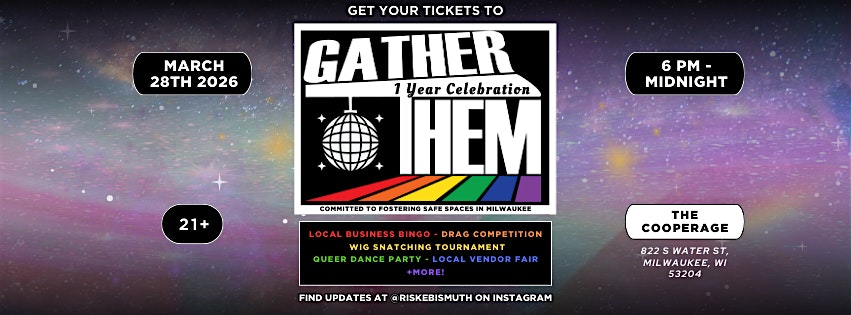 by admin13Feb Gather Them Anniversary! at The Cooperage – Milwaukee, WI Gather Them Anniversary! at The Cooperage – Milwaukee, WI 4 4 people viewed this event. Gather Them returns for another iteration of the wildly popular queer dance party! Tickets-RSVP Link Date And Time Saturday, March 28th, 2026 11:00 PM (PST) Venue The Cooperage Location 822 South Water Street, Milwaukee, WI 53204 Event Types Community & CultureParty or Social Gathering Event Category MilwaukeeWisconsin Share With Friends Facebook Twitter Linkedin Xing Pinterest Share This Post: