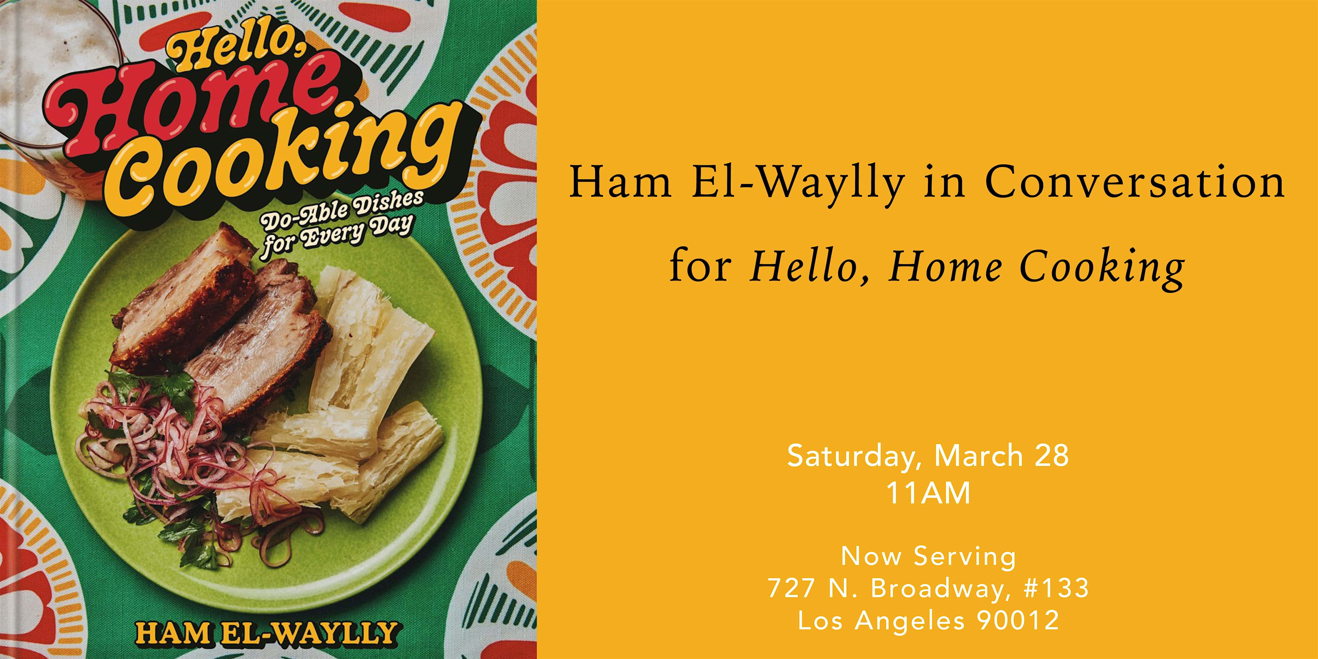 by admin14Feb Ham El-Waylly in Conversation for Hello, Home Cooking at Now Serving – Los Angeles, CA Ham El-Waylly in Conversation for Hello, Home Cooking at Now Serving – Los Angeles, CA 1 1 people viewed this event. Ham El-Waylly in Conversation with Roy Choi for Hello, Home Cooking. Book signing to follow. Tickets-RSVP Link Date And Time Saturday, March 28th, 2026 06:00 PM (PST) Venue Now Serving Location 727 North Broadway, Los Angeles, CA 90012 Event Types Food & Drink Event Category CaliforniaLos Angeles Share With Friends Facebook Twitter Linkedin Xing Pinterest Share This Post: