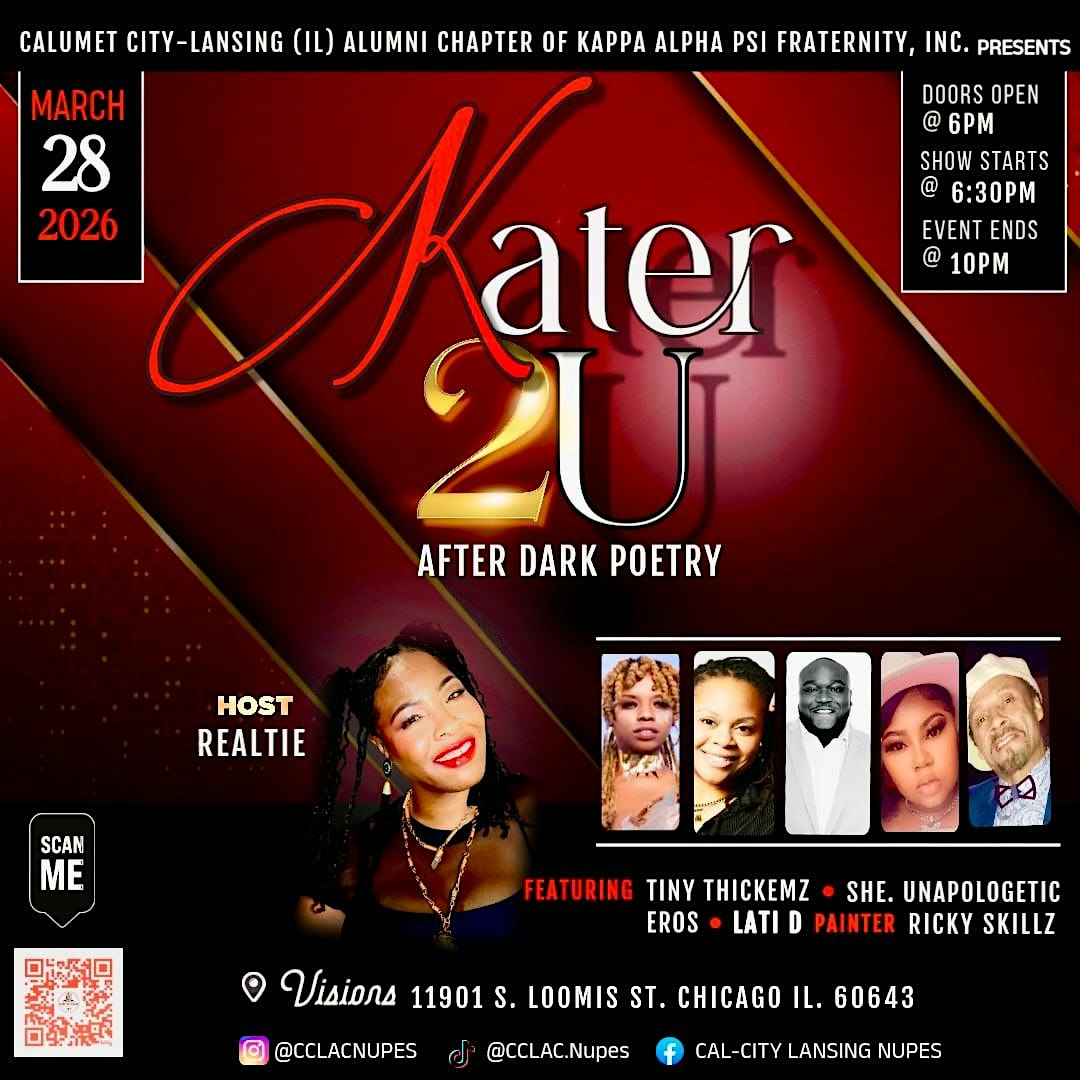 by admin27Feb Kater 2U After Dark Poetry at Visions – Chicago, IL Kater 2U After Dark Poetry at Visions – Chicago, IL 2 2 people viewed this event. Join us for Kater 2U, an intimate after-dark poetry experience hosted by the Calumet City–Lansing Alumni Tickets-RSVP Link Date And Time Saturday, March 28th, 2026 @ 06:00 PM Location 11901 South Loomis, Chicago, IL 60643 Event Types Food & DrinkOther Event Category ChicagoIllinois Share With Friends Facebook Twitter Linkedin Xing Pinterest Share This Post: