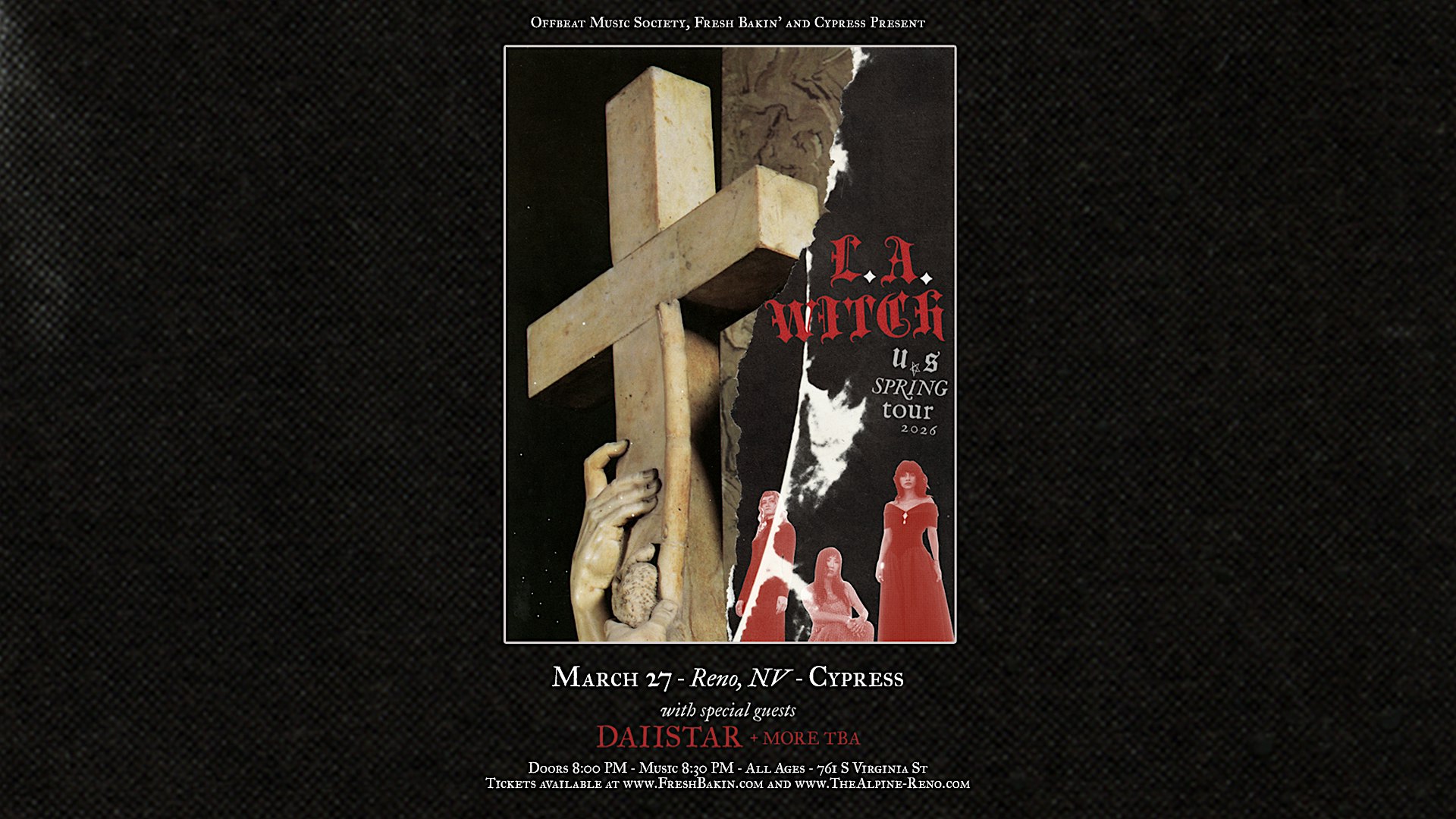 by admin13Feb L.A. Witch w/ Daiistar at Cypress at Cypress Music Venue & Private Events – Reno, NV L.A. Witch w/ Daiistar at Cypress at Cypress Music Venue & Private Events – Reno, NV 1 1 people viewed this event. L.A. Witch performs at Cypress in Reno on March 27 with special guest Daiistar. Tickets-RSVP Link Date And Time Saturday, March 28th, 2026 03:00 AM (PST) Venue Cypress Music Venue & Private Events Location 761 South Virginia Street, Reno, NV 89501 Event Types Concert or PerformanceMusic Event Category NevadaReno Share With Friends Facebook Twitter Linkedin Xing Pinterest Share This Post: