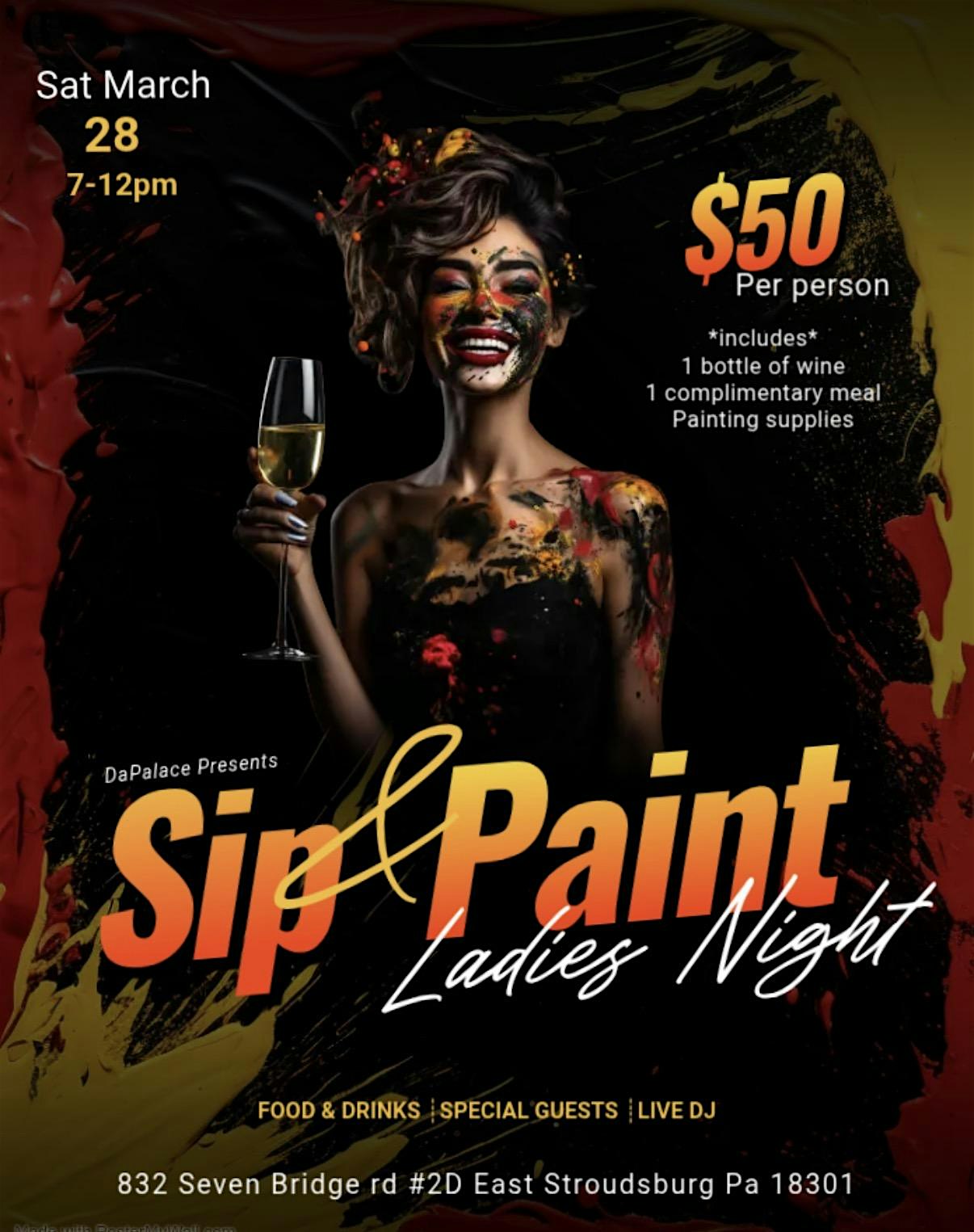 by admin27Feb Ladies Night Sip N Paint at 832 Seven Bridge Rd – East Stroudsburg, PA Ladies Night Sip N Paint at 832 Seven Bridge Rd – East Stroudsburg, PA 1 1 people viewed this event. Ladies, bring your squad and sip, paint, and dance the night away! Live DJ and a very sexy surprise waiting Tickets-RSVP Link Date And Time Saturday, March 28th, 2026 @ 07:00 PM Location 832 Seven Bridge Road, East Stroudsburg, PA 18301 Event Types Food & DrinkParty or Social Gathering Event Category Pennsylvania Share With Friends Facebook Twitter Linkedin Xing Pinterest Share This Post: