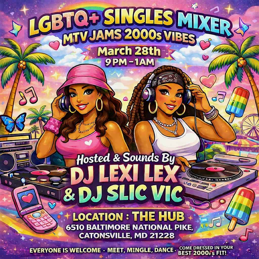 by admin23Feb LGBTQ+ Singles Mixer at The Hub Sakaki Izakaya Bar and Karaoke – Catonsville, MD LGBTQ+ Singles Mixer at The Hub Sakaki Izakaya Bar and Karaoke – Catonsville, MD 2 2 people viewed this event. Running it back 2000s style ✨ Put your flyest fit on and meet us at The Hub! LGBTQ+ Mixer — meet, mingle, and dance all night Y2K vibes only Tickets-RSVP Link Date And Time Saturday, March 28th, 2026 09:00 PM (PST) Venue The Hub Sakaki Izakaya Bar and Karaoke Location 6510 Baltimore National Pike, Catonsville, MD 21228 Event Types Community & CultureParty or Social Gathering Event Category Maryland Share With Friends Facebook Twitter Linkedin Xing Pinterest Share This Post: