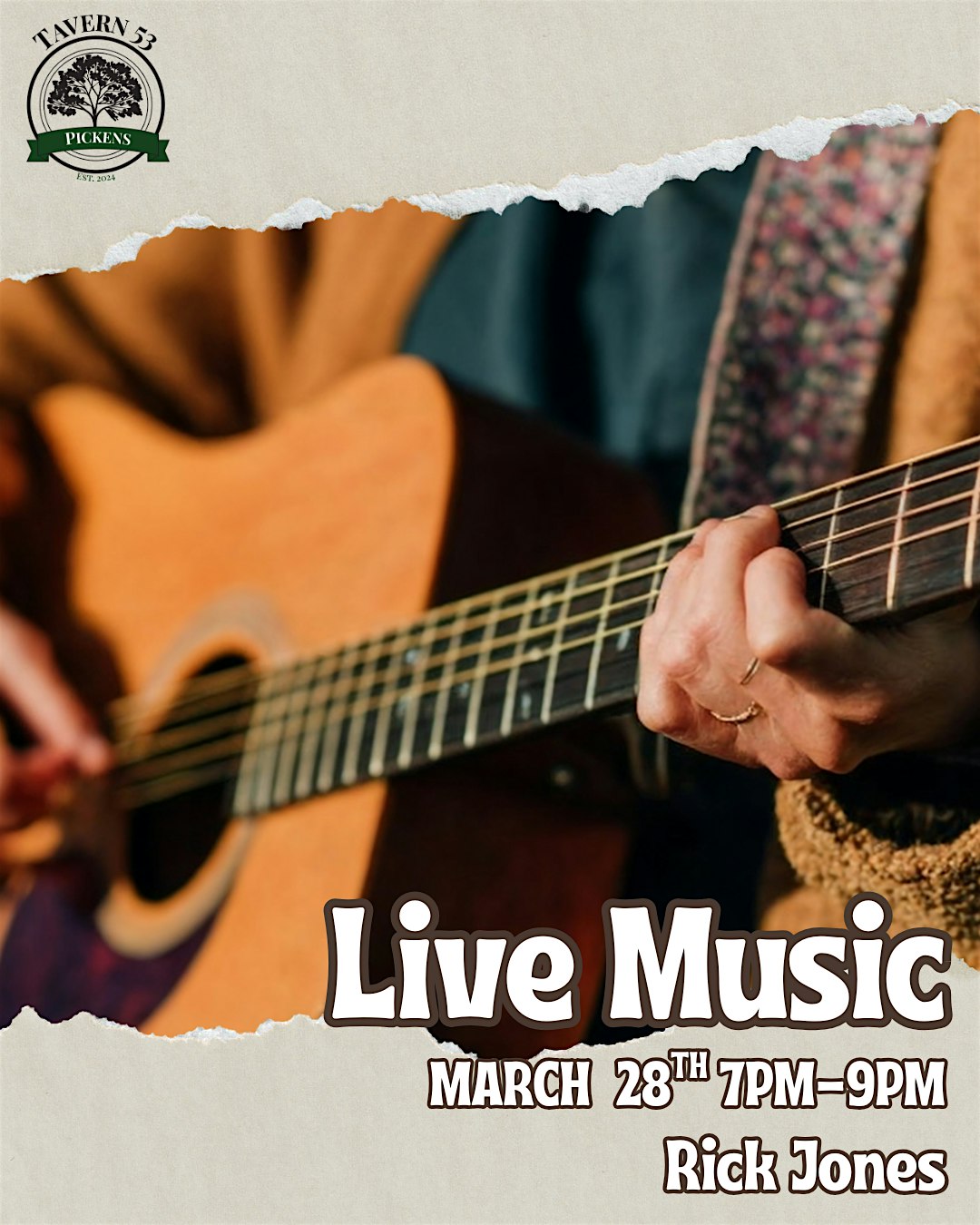 by admin24Feb Live Music with Rick Jones at Tavern 53 at Tavern 53 – Pickens, SC Live Music with Rick Jones at Tavern 53 at Tavern 53 – Pickens, SC 2 2 people viewed this event. Join us at Tavern 53 for a killer night of live tunes with Rick Jones—good vibes and great music guaranteed! Tickets-RSVP Link Date And Time Saturday, March 28th, 2026 07:00 PM (PST) Venue Tavern 53 Location 1018 State Road S-39-204, Pickens, SC 29671 Event Types Concert or PerformanceMusic Event Category South Carolina Share With Friends Facebook Twitter Linkedin Xing Pinterest Share This Post: