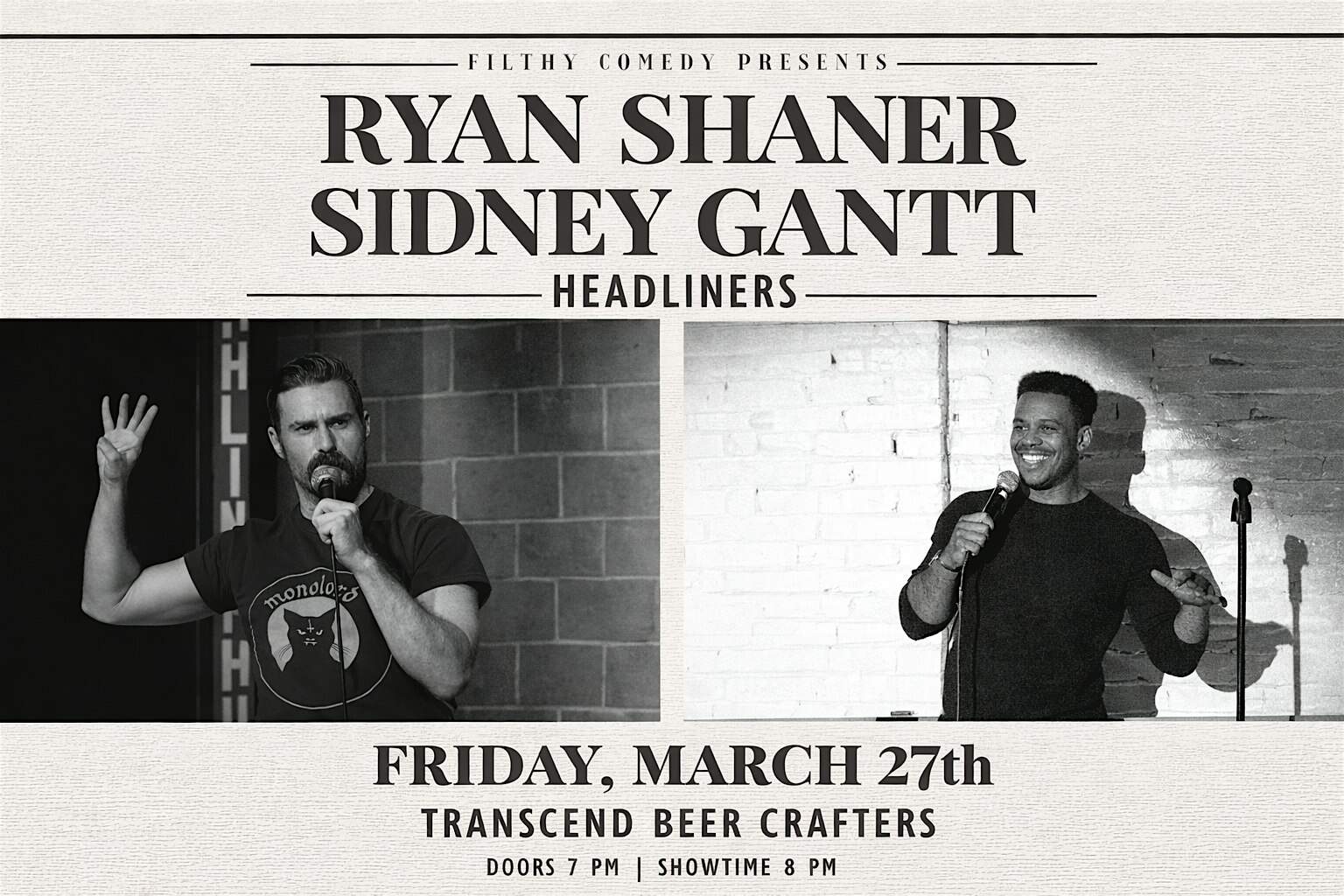 by admin14Feb Live Standup Comedy at Transcend Beer Crafters! at Transcend Beer Crafters – Plainville, CT Live Standup Comedy at Transcend Beer Crafters! at Transcend Beer Crafters – Plainville, CT 1 1 people viewed this event. Filthy Comedy presents headliners Ryan Shaner & Sidney Gantt for one killer night of stand-up at Transcend Beer Crafters. Tickets-RSVP Link Date And Time Saturday, March 28th, 2026 12:00 AM (PST) Venue Transcend Beer Crafters Location 45 Northwest Drive, Plainville, CT 6062 Event Types Concert or PerformancePerforming & Visual Arts Event Category Connecticut Share With Friends Facebook Twitter Linkedin Xing Pinterest Share This Post: