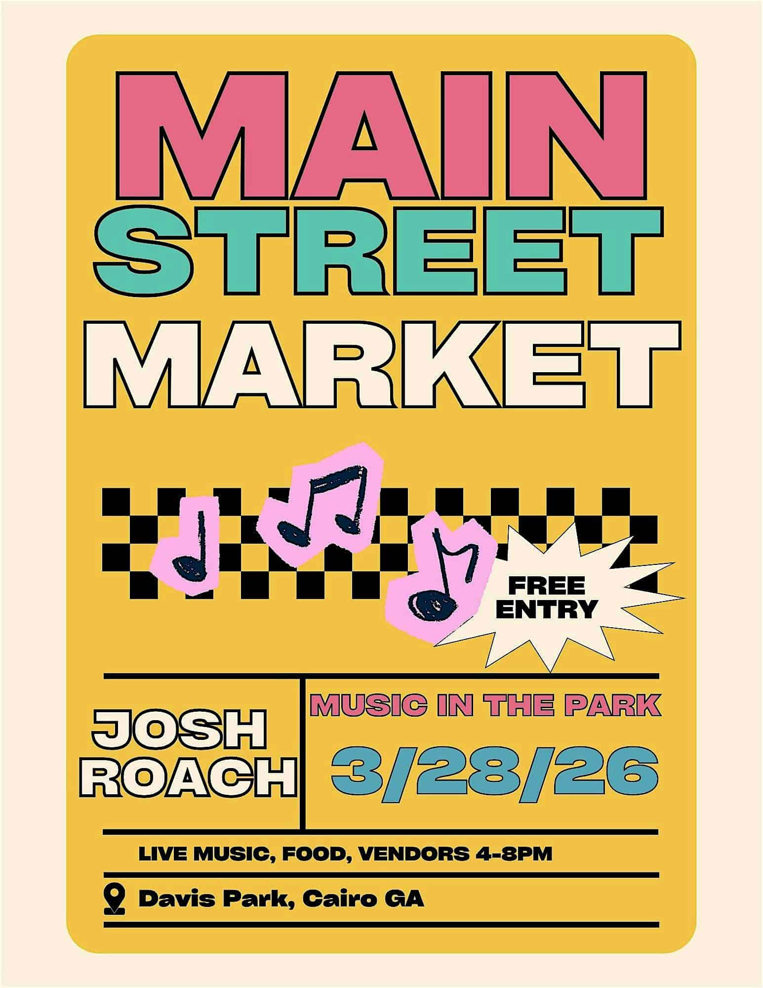 by admin14Feb Main Street Market- Music in the Park at Davis Park – Cairo, GA Main Street Market- Music in the Park at Davis Park – Cairo, GA 2 2 people viewed this event. Main Street Market at Davis Park in Cairo, GA! March 28, 4–8pm. Live music by Josh Roach 6–8pm. Vendor fee $25. Tickets-RSVP Link Date And Time Saturday, March 28th, 2026 08:00 PM (PST) Venue Davis Park Location 230 Fourth Ave NE, Cairo, GA 39828 Event Types Community & CultureConcert or Performance Event Category Georgia Share With Friends Facebook Twitter Linkedin Xing Pinterest Share This Post: