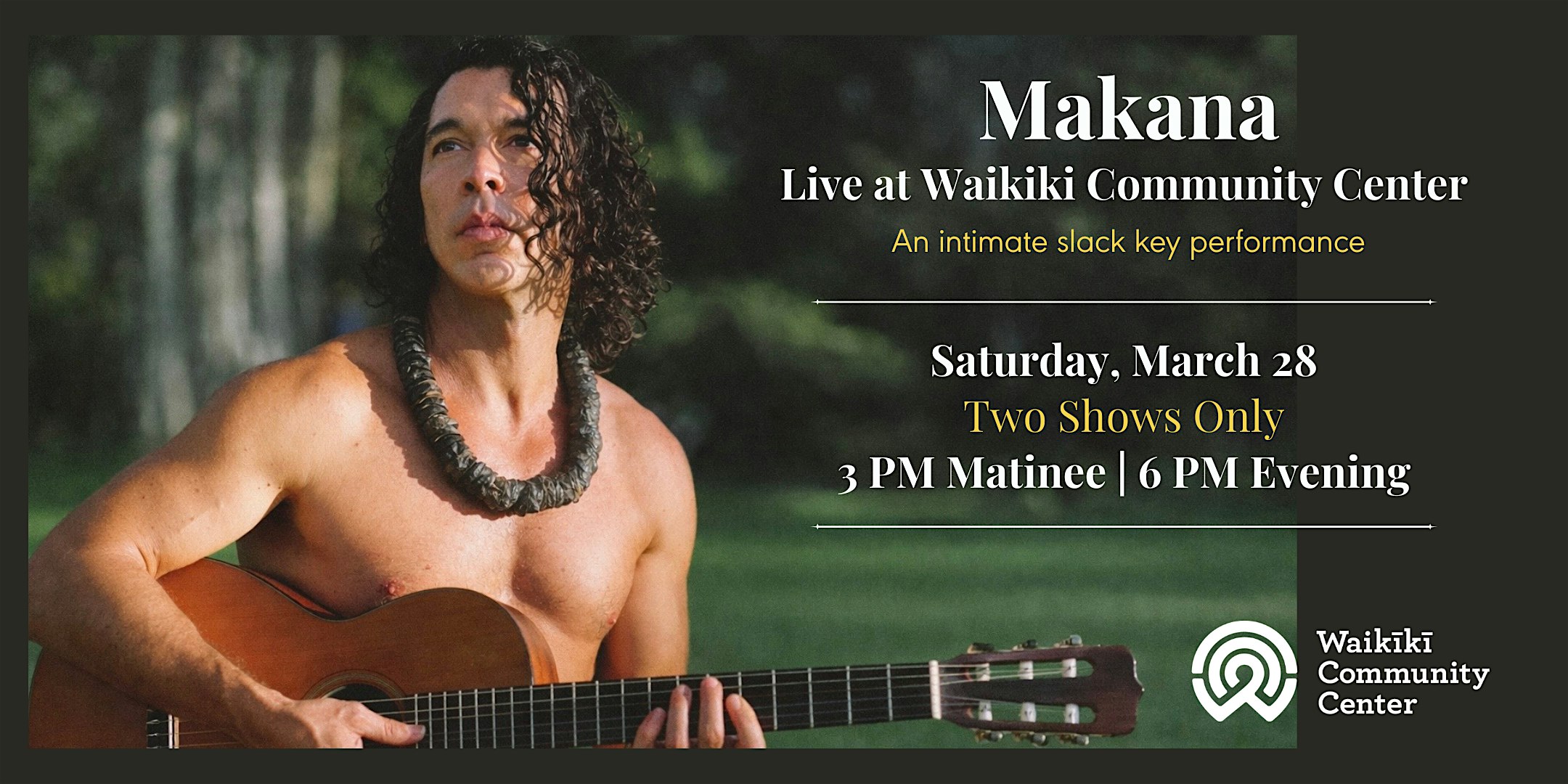by admin24Feb Makana at Waikīkī Community Center: Songs, Stories & Slack Key at Waikiki Community Center – Honolulu, HI Makana at Waikīkī Community Center: Songs, Stories & Slack Key at Waikiki Community Center – Honolulu, HI 4 4 people viewed this event. An intimate afternoon of Hawaiian slack key guitar, songs, and stories with Makana — shared in the heart of our community. Tickets-RSVP Link Date And Time Saturday, March 28th, 2026 03:00 PM (PST) Venue Waikiki Community Center Location 310 Paoakalani Avenue, Honolulu, HI 96815 Event Types Concert or PerformanceMusic Event Category HawaiiHonolulu Share With Friends Facebook Twitter Linkedin Xing Pinterest Share This Post:
