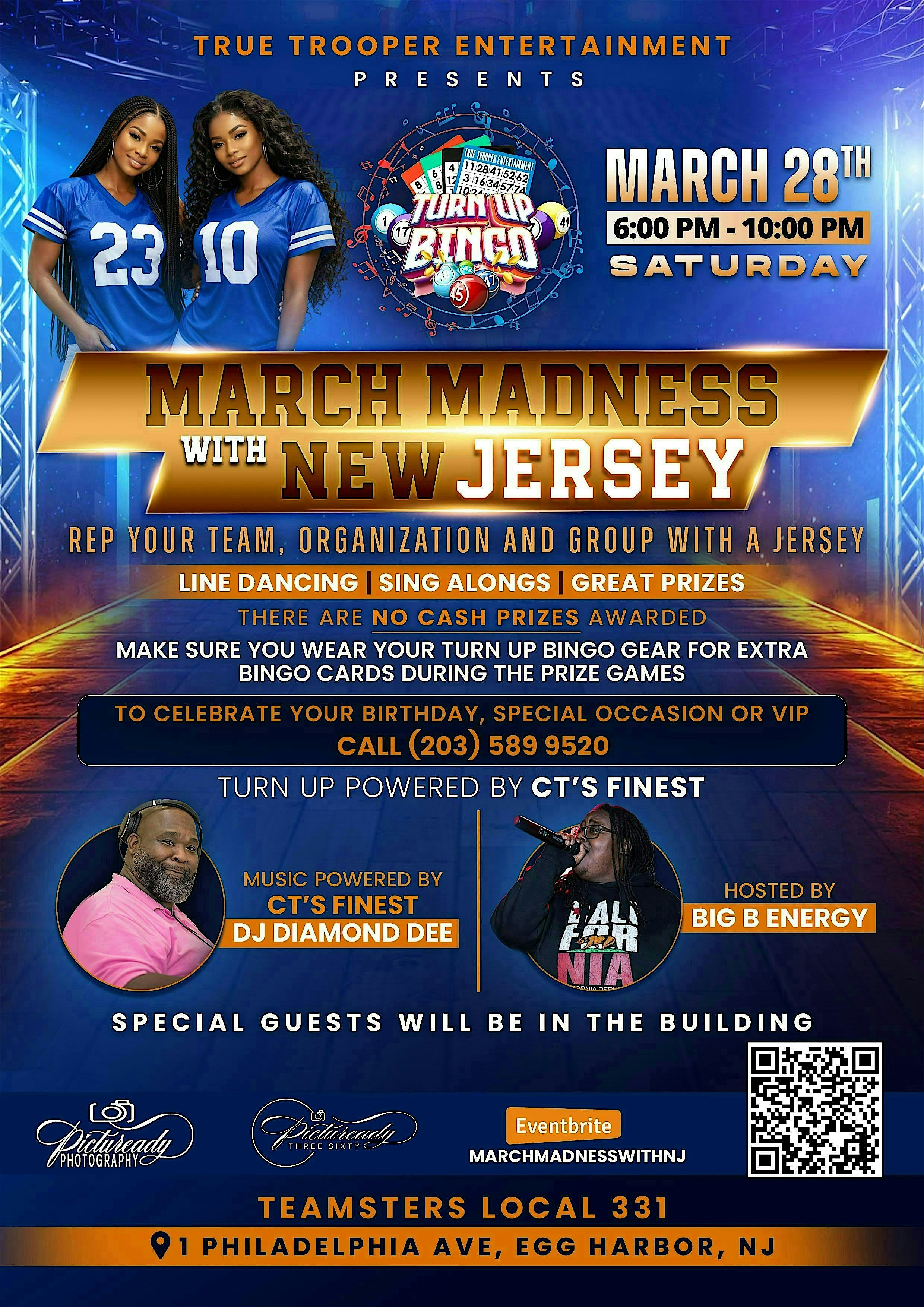by admin13Feb “March Madness With New JERSEY” at Teamsters Local 331 – Egg Harbor City, NJ “March Madness With New JERSEY” at Teamsters Local 331 – Egg Harbor City, NJ 1 1 people viewed this event. WELCOME TO THE EVOLUTION OF BINGO! This is not your grandparents’ bingo. Be prepared to party, eat, drink and win some amazing prizes! Tickets-RSVP Link Date And Time Saturday, March 28th, 2026 10:00 PM (PST) Venue Teamsters Local 331 Location 1 Philadelphia Avenue, Egg Harbor City, NJ 8215 Event Types MusicParty or Social Gathering Event Category New Jersey Share With Friends Facebook Twitter Linkedin Xing Pinterest Share This Post: