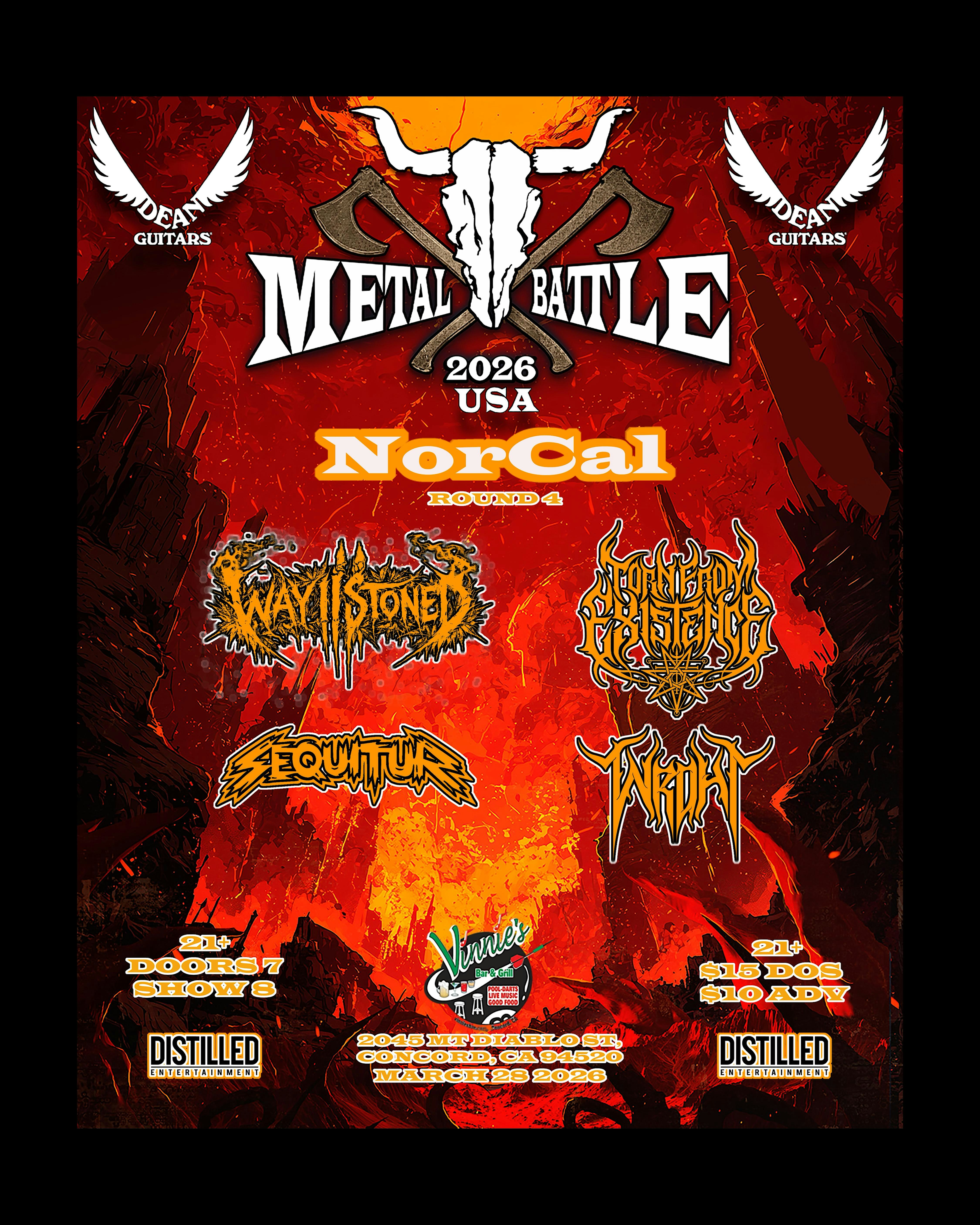 by admin27Feb Metal Battle 2026: NorCal Round 4 – Live at Vinnie’s Bar & Grill at Vinnie’s Bar & Grill – Concord, CA Metal Battle 2026: NorCal Round 4 – Live at Vinnie’s Bar & Grill at Vinnie’s Bar & Grill – Concord, CA 1 1 people viewed this event. Metal Battle 2026 NorCal Round 4 storms Vinnie’s March 28—live heavy metal, doors 7pm, show 8pm, 21+. Tickets-RSVP Link Date And Time Saturday, March 28th, 2026 07:00 PM (PST) Venue Vinnie's Bar & Grill Location 2045 Mount Diablo Street, Concord, CA 94520 Event Types Music Event Category CaliforniaOakland Share With Friends Facebook Twitter Linkedin Xing Pinterest Share This Post: