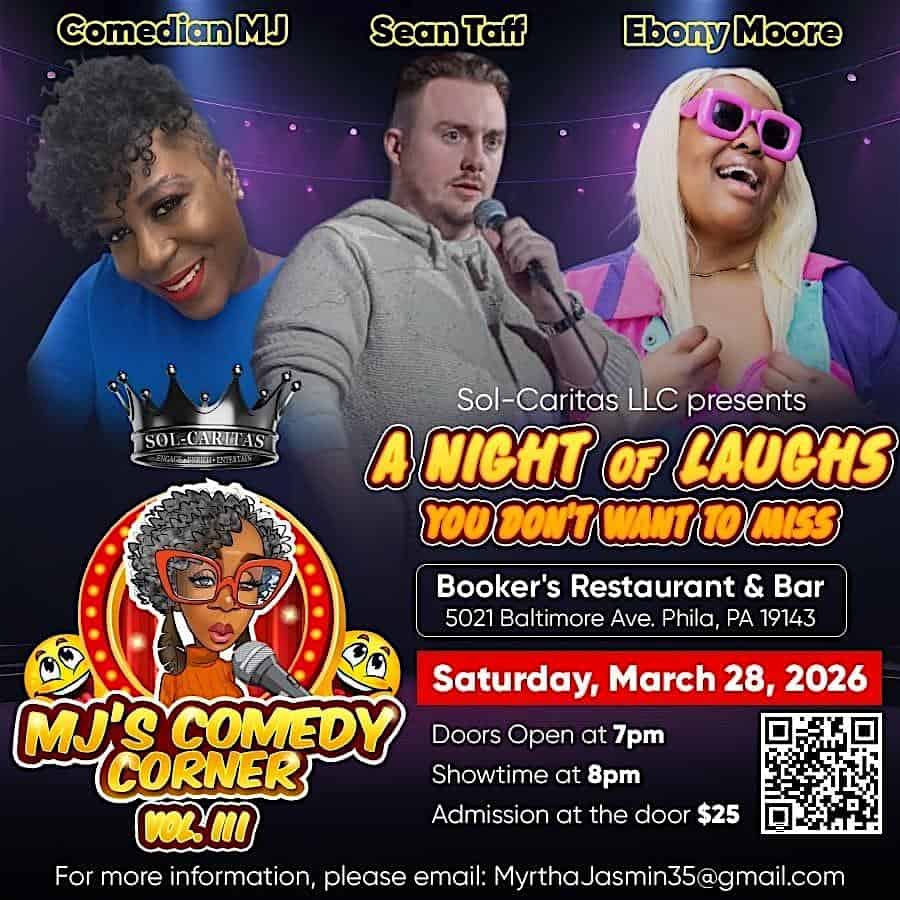 by admin14Feb MJ’s Comedy Corner at Booker’s Restaurant & Bar – Philadelphia, PA MJ’s Comedy Corner at Booker’s Restaurant & Bar – Philadelphia, PA 1 1 people viewed this event. Get ready to laugh until your sides hurt at MJ’s Comedy Corner, where the jokes are as fresh as the drinks! Tickets-RSVP Link Date And Time Saturday, March 28th, 2026 11:00 PM (PST) Venue Booker's Restaurant & Bar Location 5021 Baltimore Avenue, Philadelphia, PA 19143 Event Types Concert or PerformancePerforming & Visual Arts Event Category PennsylvaniaPhiladelphia Share With Friends Facebook Twitter Linkedin Xing Pinterest Share This Post: