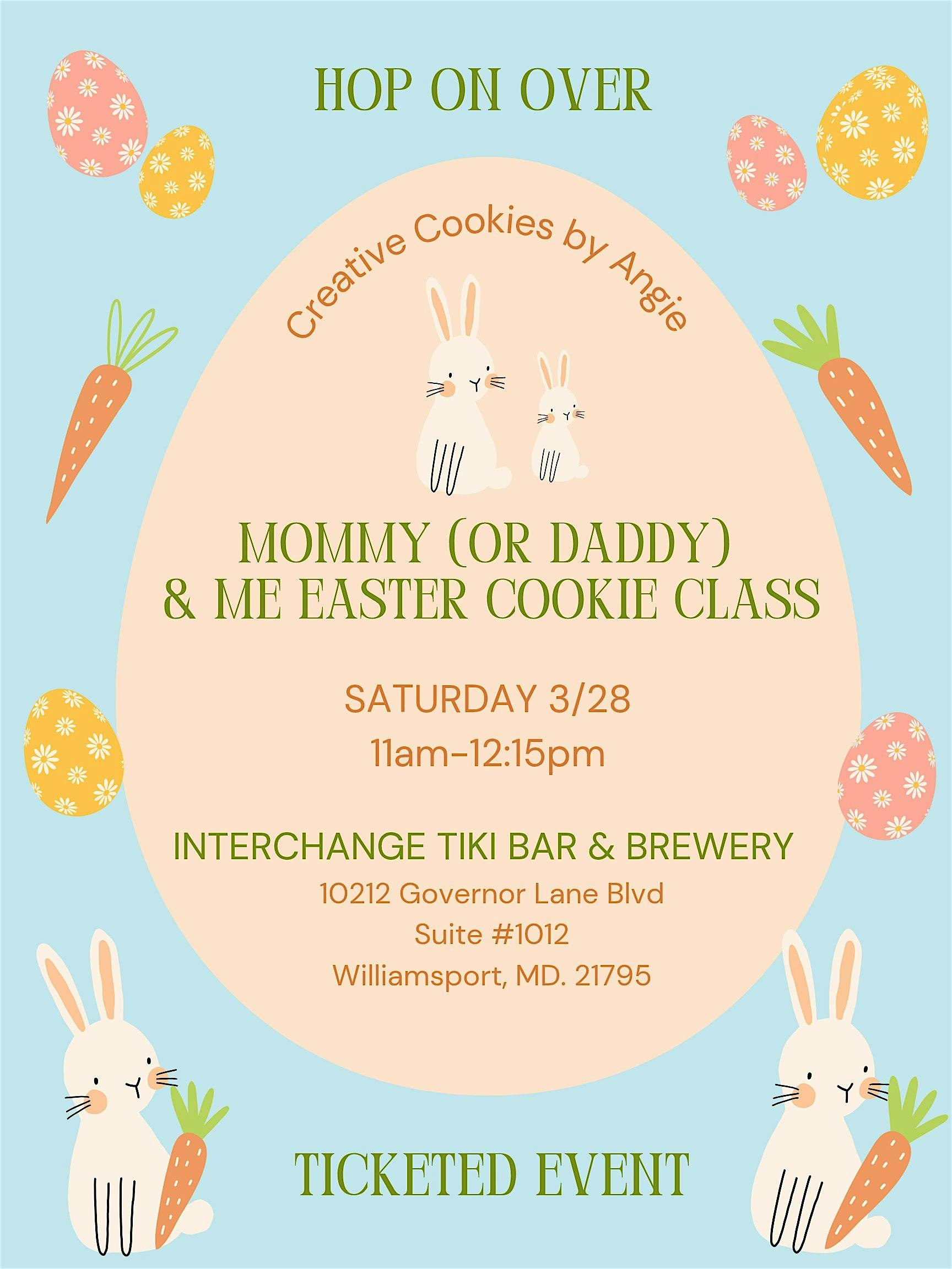 Mommy (or Daddy) & Me Cookie decorating class- Easter edition at Interchange Tiki Bar & Brewing – Williamsport, MD Mommy (or Daddy) & Me Cookie decorating class- Easter edition at Interchange Tiki Bar & Brewing – Williamsport, MD 1 1 people viewed this event. JOIN US FOR OUR MOMMY (OR DADDY) & ME COOKIE CLASS YOUR KIDDOS WILL LEARN HOW TO DECORATE 4 EASTER THEMED COOKIES! Tickets-RSVP Link Register for event Date And Time Saturday, March 28th, 2026 @ 11:00 AM Location 10212 Governor Lane Boulevard, Williamsport, MD 21795 Event Types Class, Training, or WorkshopFood & Drink Event Category Maryland Share With Friends Facebook Twitter Linkedin Xing Pinterest