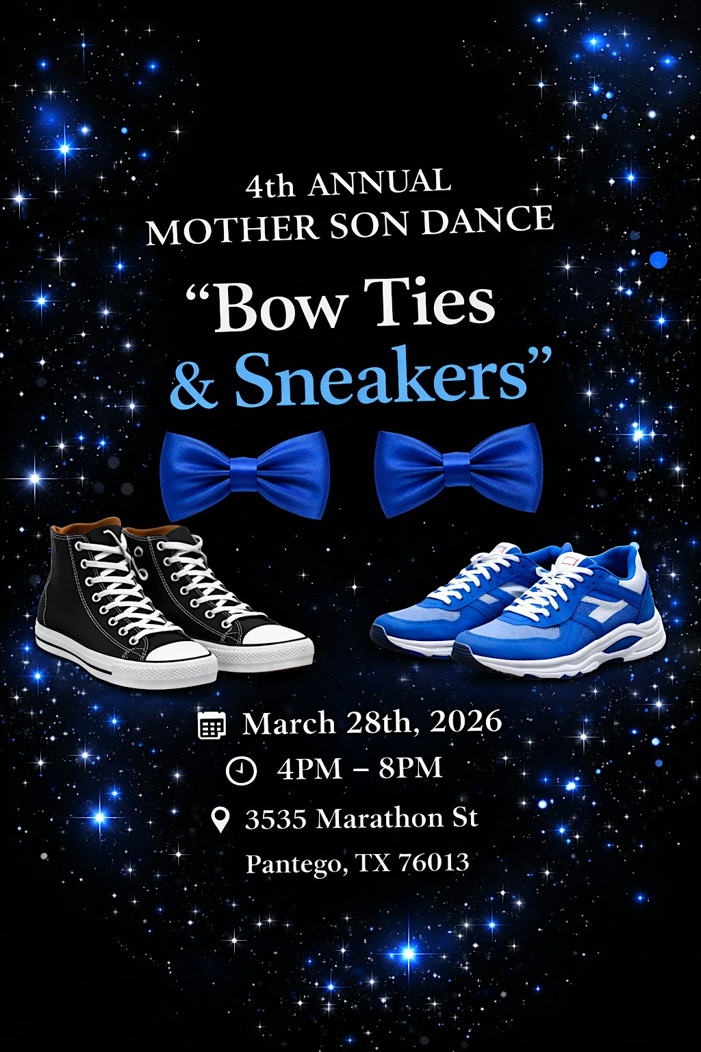 by admin24Feb Mother Son Dance “Bow ties & sneakers at 3535 Marathon St – Pantego, TX Mother Son Dance “Bow ties & sneakers at 3535 Marathon St – Pantego, TX 2 2 people viewed this event. Get ready to bust a move with your son at the Mother Son Dance – Bow ties & sneakers, where fancy meets fun on the dance floor! Tickets-RSVP Link Date And Time Saturday, March 28th, 2026 04:00 PM (PST) Venue 3535 Marathon St Location 3535 Marathon Street, Pantego, TX 76013 Event Types Party or Social Gathering Event Category Texas Share With Friends Facebook Twitter Linkedin Xing Pinterest Share This Post: