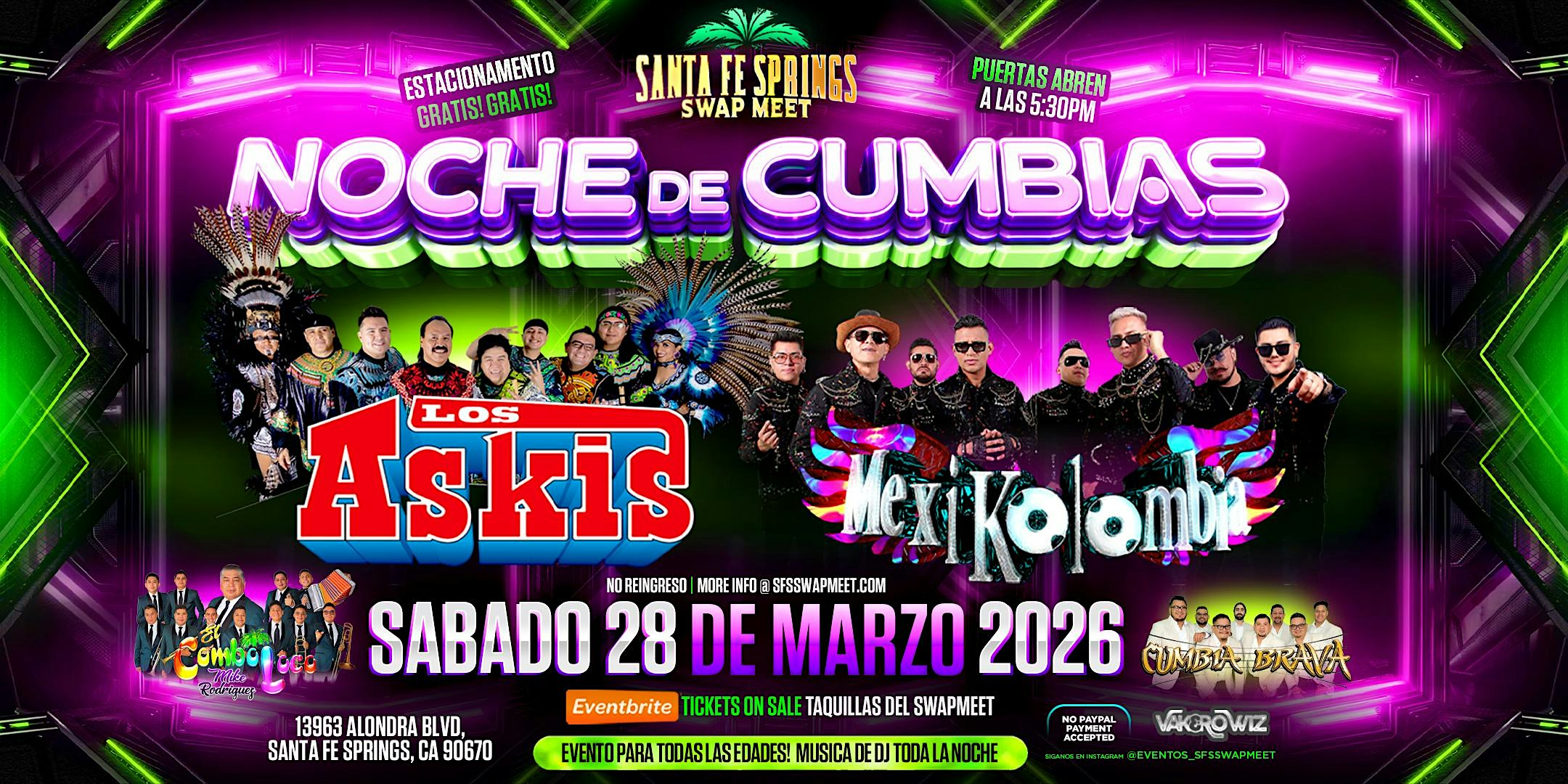 by admin24Feb Noche de Cumbias con Los Askis, MexiKolombia, Cumbia Brava, y El Combo Loco at Santa Fe Springs Swap Meet – Santa Fe Springs, CA Noche de Cumbias con Los Askis, MexiKolombia, Cumbia Brava, y El Combo Loco at Santa Fe Springs Swap Meet – Santa Fe Springs, CA 2 2 people viewed this event. Santa Fe Springs Swap Meet presenta Noche de Cumbias con Los Askis, MexiKolombia, Cumbia Brava, y El Combo Loco! Tickets-RSVP Link Date And Time Saturday, March 28th, 2026 05:00 PM (PST) Venue Santa Fe Springs Swap Meet Location 13963 Alondra Blvd, Santa Fe Springs, CA 90670 Event Types Concert or PerformanceMusic Event Category California Share With Friends Facebook Twitter Linkedin Xing Pinterest Share This Post: