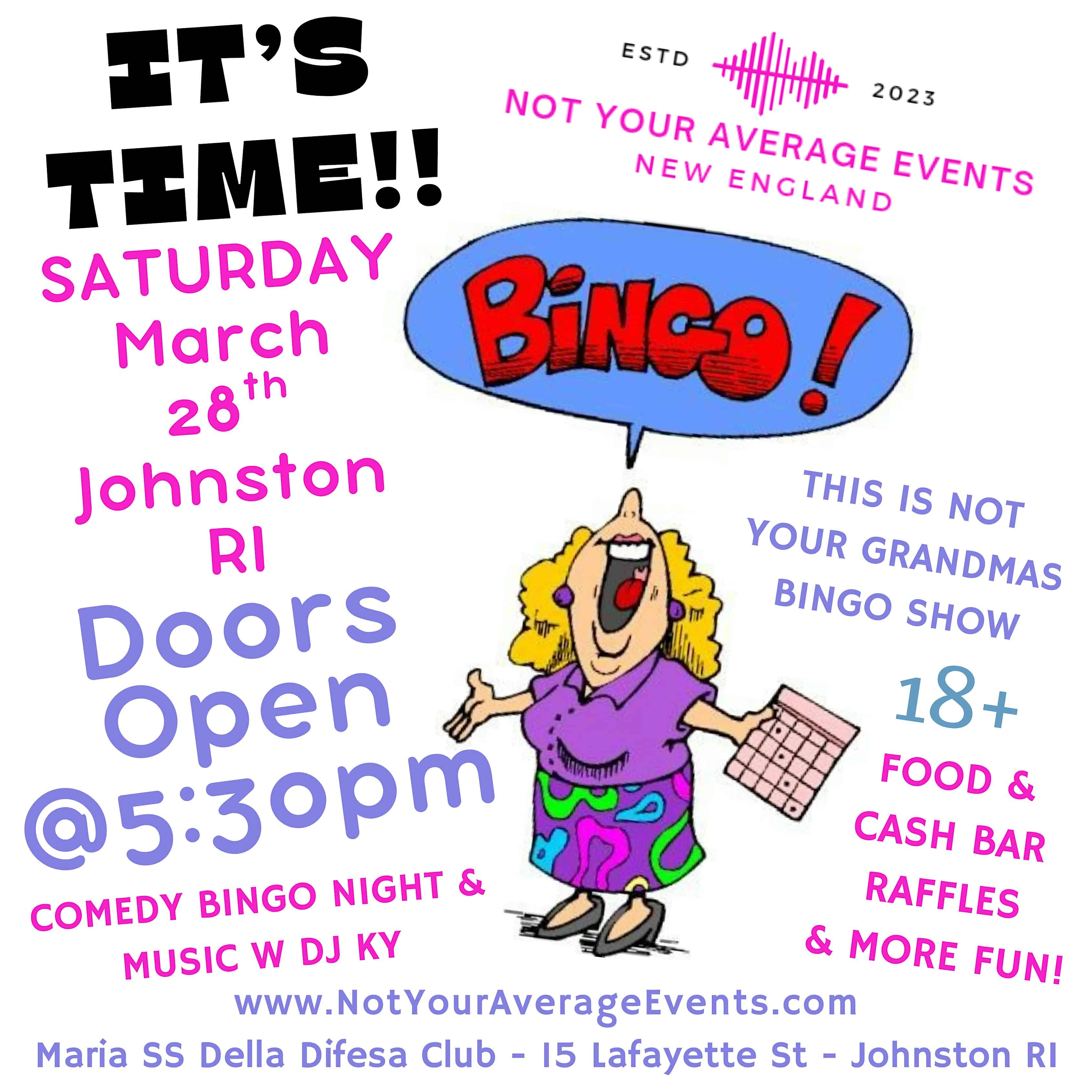 by admin14Feb Not Your Grandmas Comedy Bingo Show in Johnston RI – Saturday March 28th at 15 Lafayette St – Johnston, RI Not Your Grandmas Comedy Bingo Show in Johnston RI – Saturday March 28th at 15 Lafayette St – Johnston, RI 1 1 people viewed this event. DJ KY and the Not Your Average Events Crew team up for this epic night of #Comedy – #BINGO & #More! Tickets-RSVP Link Date And Time Saturday, March 28th, 2026 09:00 PM (PST) Venue 15 Lafayette St Location 15 Lafayette Street, Johnston, RI 2919 Event Types Concert or PerformancePerforming & Visual Arts Event Category Rhode Island Share With Friends Facebook Twitter Linkedin Xing Pinterest Share This Post: