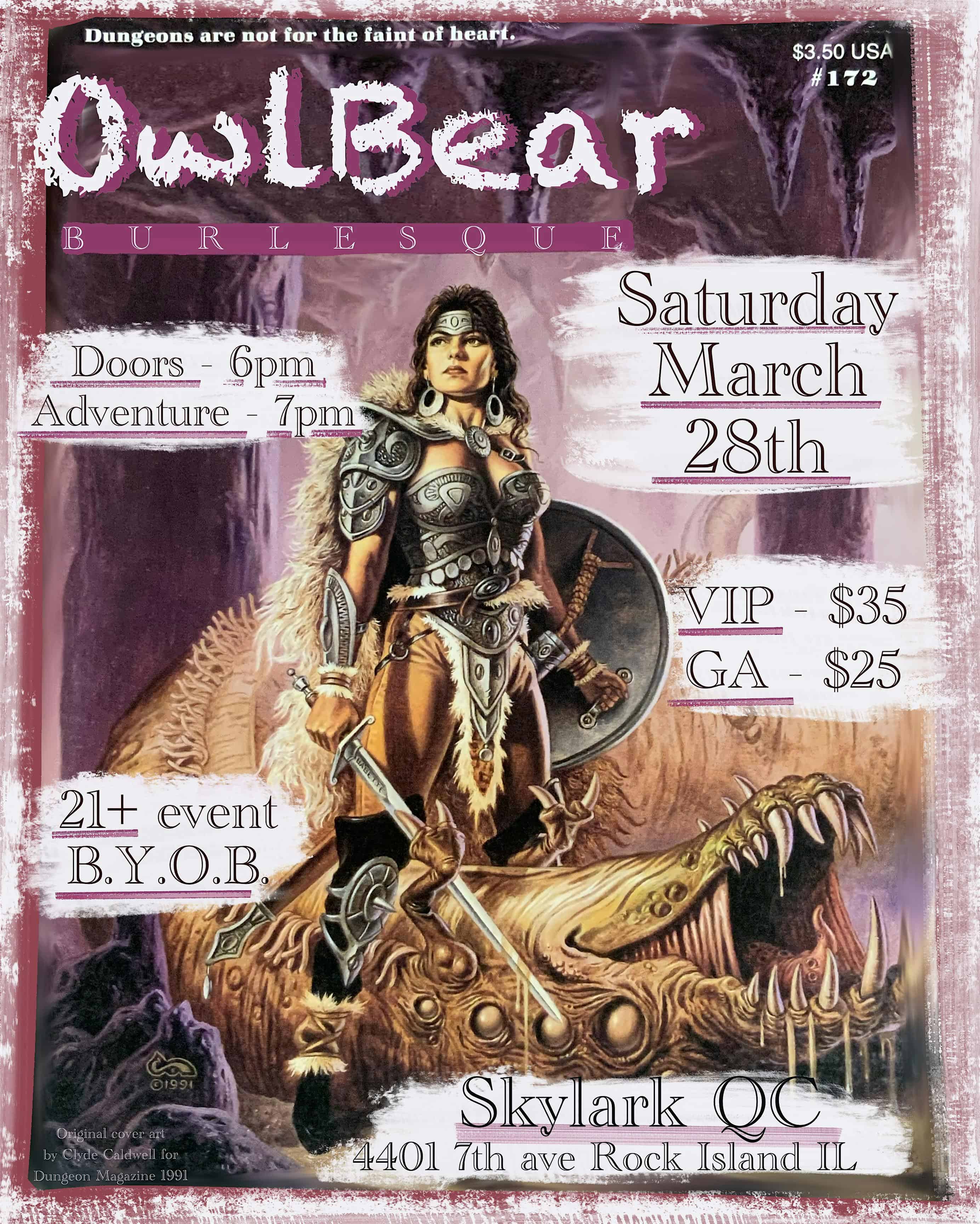 by admin14Feb OwlBear Burlesque presents Another NerdBird Adventure at Skylark QC – Rock Island, IL OwlBear Burlesque presents Another NerdBird Adventure at Skylark QC – Rock Island, IL 2 2 people viewed this event. combo of live action role playing with vaudeville style entertainment mixed with a dash of your favorite spicy book feels – 21+ BYOB Tickets-RSVP Link Date And Time Saturday, March 28th, 2026 11:00 PM (PST) Venue Skylark QC Location 4401 7th Avenue, Rock Island, IL 61201 Event Types Concert or PerformancePerforming & Visual Arts Event Category Illinois Share With Friends Facebook Twitter Linkedin Xing Pinterest Share This Post: