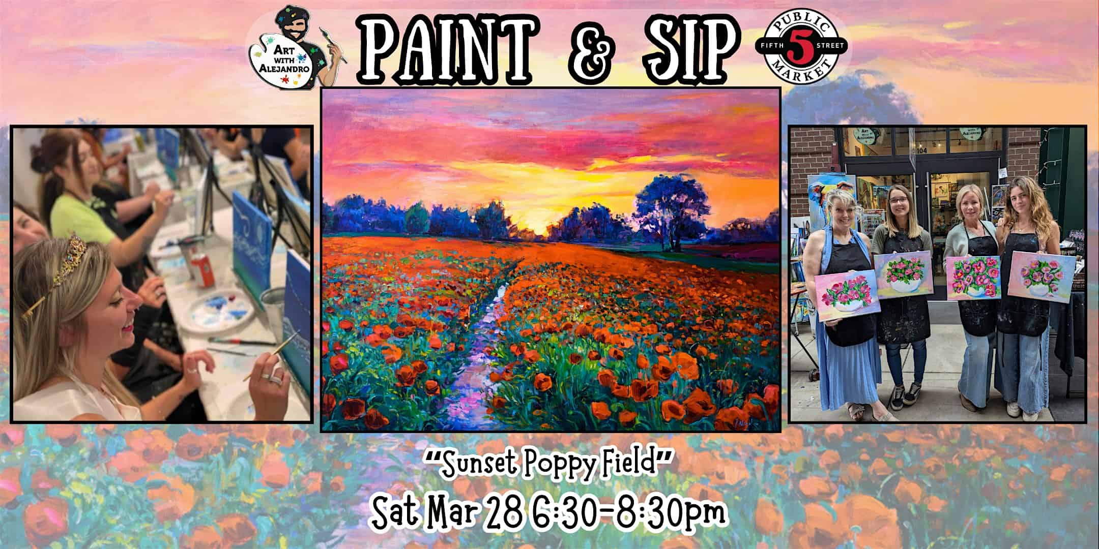 by admin23Feb Paint & Sip at 5th St Alley “Sunset Poppy Field” at Art with Alejandro – Eugene, OR Paint & Sip at 5th St Alley “Sunset Poppy Field” at Art with Alejandro – Eugene, OR 3 3 people viewed this event. Join us for a fun, creative afternoon. All skill levels welcome. Materials provided & BYOB Tickets-RSVP Link Date And Time Saturday, March 28th, 2026 06:00 PM (PST) Venue Art with Alejandro Location 590 Pearl St, Eugene, OR 97401 Event Types Party or Social GatheringPerforming & Visual Arts Event Category EugeneOregon Share With Friends Facebook Twitter Linkedin Xing Pinterest Share This Post:
