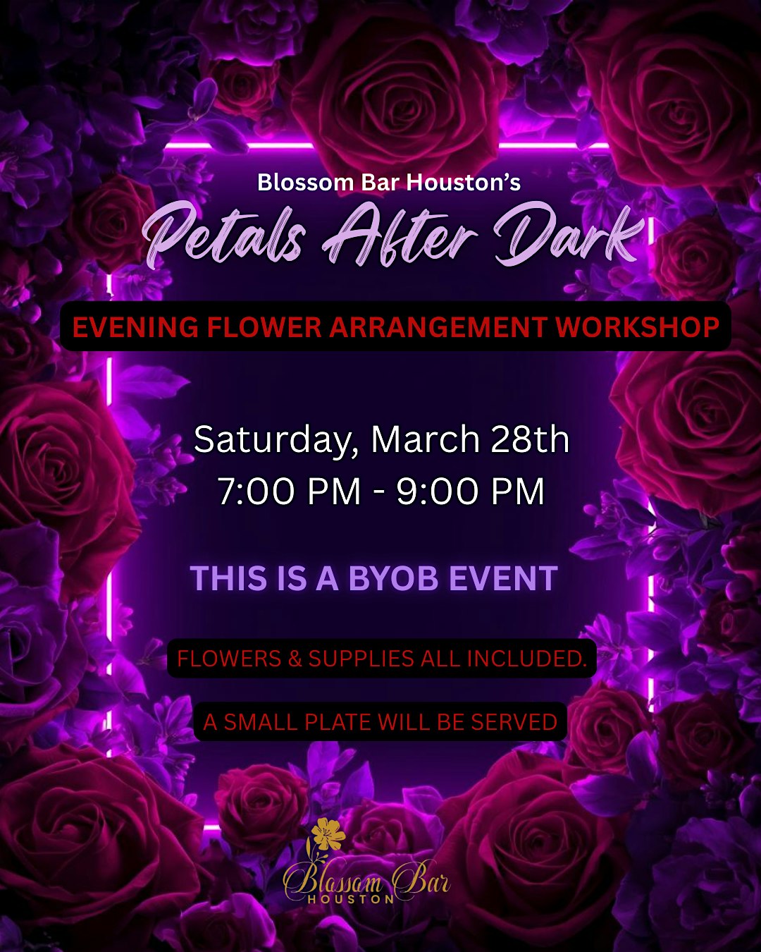 by admin27Feb Petals After Dark (Evening Flower Arrangement Workshop) at 7241 Lawndale St c – Houston, TX Petals After Dark (Evening Flower Arrangement Workshop) at 7241 Lawndale St c – Houston, TX 3 3 people viewed this event. Petals After Dark: An evening floral workshop with luxe ambiance, BYOB, light bites, and all supplies included Tickets-RSVP Link Date And Time Saturday, March 28th, 2026 07:00 PM (PST) Venue 7241 Lawndale St c Location 7241 Lawndale Street, Houston, TX 77012 Event Types Food & Drink Event Category HoustonTexas Share With Friends Facebook Twitter Linkedin Xing Pinterest Share This Post:
