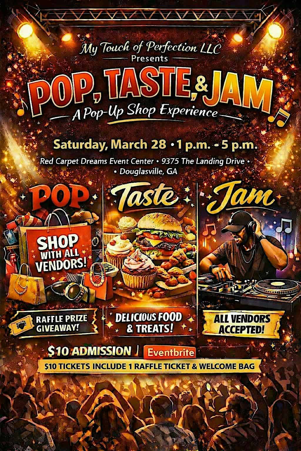 by admin14Feb Pop, Taste & Jam at Red Carpet Dreams Event Center – Douglasville, GA Pop, Taste & Jam at Red Carpet Dreams Event Center – Douglasville, GA 1 1 people viewed this event. Join us for POP, TASTE & JAM, a pop-up shop experience featuring vendors, delicious food, live DJ music, raffle prizes, and nonstop energy. Tickets-RSVP Link Date And Time Saturday, March 28th, 2026 05:00 PM (PST) Venue Red Carpet Dreams Event Center Location 9375 The Landing Drive, Douglasville, GA 30135 Event Types Festival or FairFood & Drink Event Category AtlantaGeorgia Share With Friends Facebook Twitter Linkedin Xing Pinterest Share This Post: