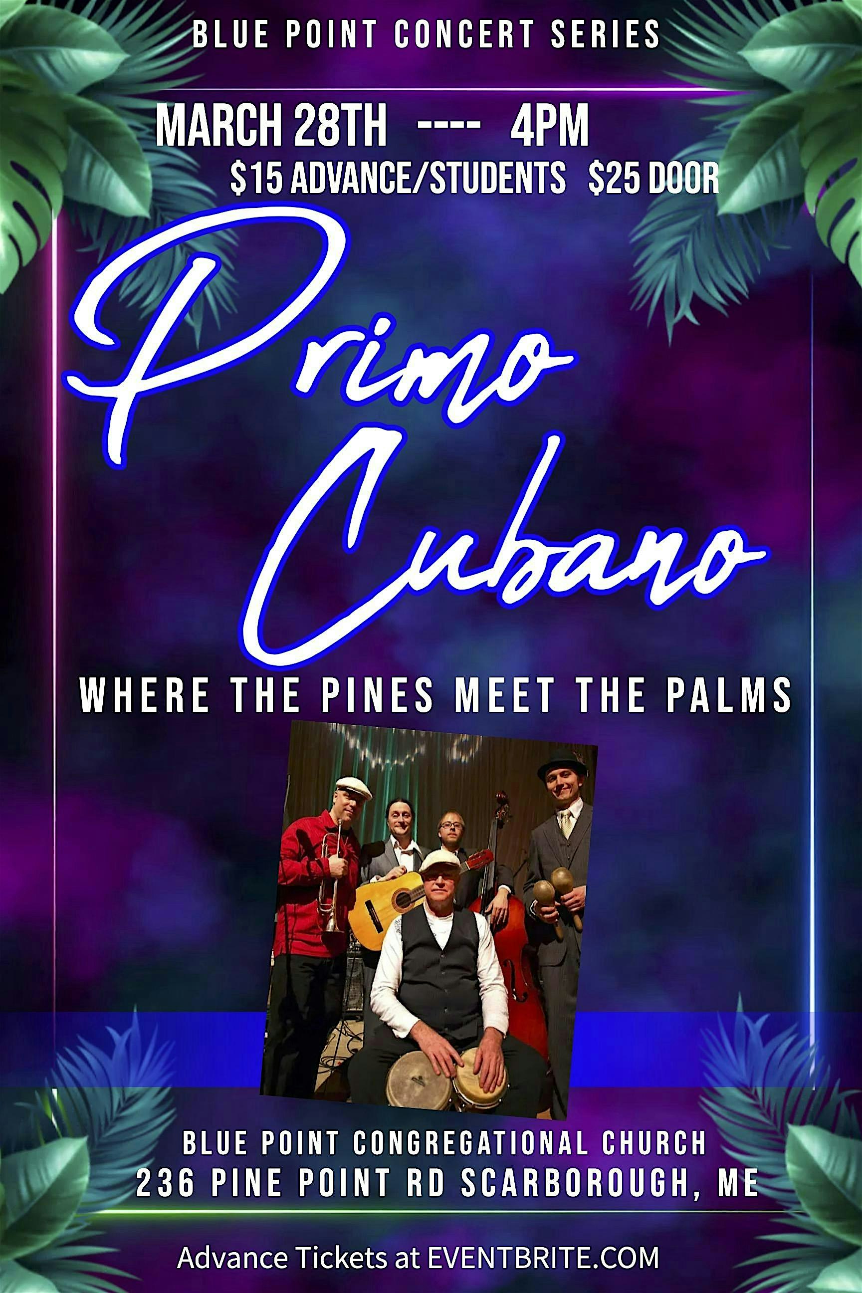 by admin13Feb Primo Cubano in Concert at Blue Point at Blue Point Congregational Church UCC – Scarborough, ME Primo Cubano in Concert at Blue Point at Blue Point Congregational Church UCC – Scarborough, ME 1 1 people viewed this event. Get ready to sway to the irresistible rhythms of Primo Cubano in Concert at Blue Point – it’s going to be a night to remember! Tickets-RSVP Link Date And Time Saturday, March 28th, 2026 08:00 PM (PST) Venue Blue Point Congregational Church UCC Location 236 Pine Point Road, Scarborough, ME 4074 Event Types Concert or PerformanceMusic Event Category Maine Share With Friends Facebook Twitter Linkedin Xing Pinterest Share This Post: