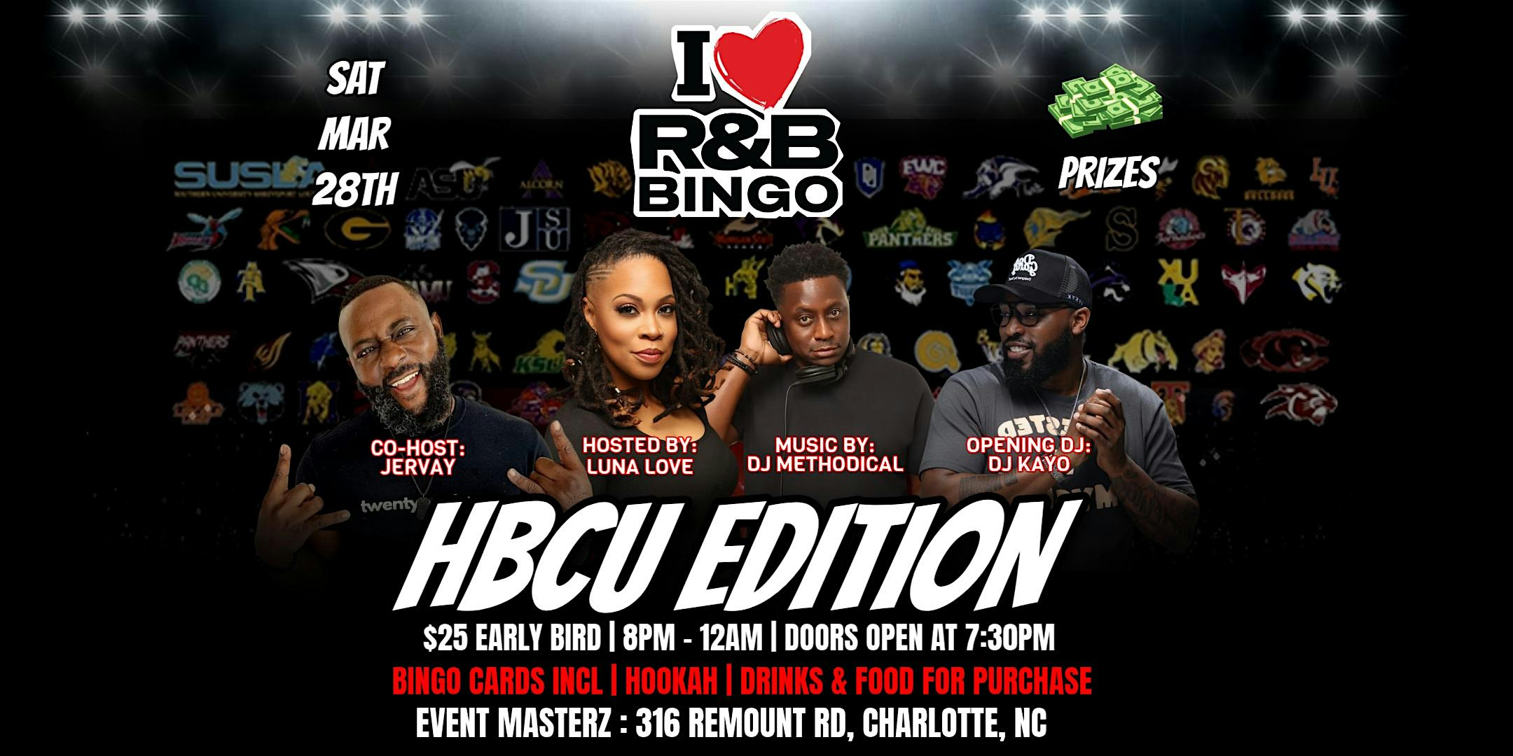 by admin24Feb R&B Bingo Charlotte – March at Event Masterz – Charlotte, NC R&B Bingo Charlotte – March at Event Masterz – Charlotte, NC 1 1 people viewed this event. Welcome to the ultimate HBCU Homecoming experience for R&B lovers! Get ready for a high-energy night with classic and modern R&B music. Tickets-RSVP Link Date And Time Saturday, March 28th, 2026 08:00 PM (PST) Venue Event Masterz Location 316 Remount Road, Charlotte, NC 28203 Event Types MusicParty or Social Gathering Event Category CharlotteNorth Carolina Share With Friends Facebook Twitter Linkedin Xing Pinterest Share This Post:
