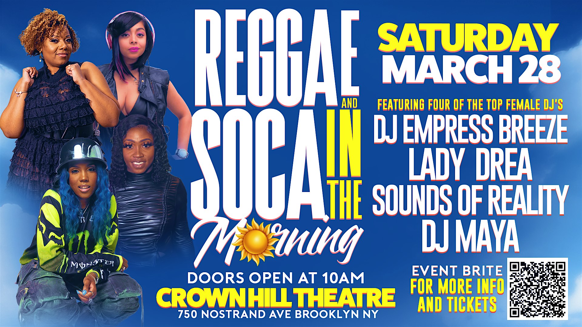 by admin24Feb Reggae & soca in the morning at Crown Hill Theatre – Brooklyn, NY Reggae & soca in the morning at Crown Hill Theatre – Brooklyn, NY 2 2 people viewed this event. Reggae & Soca in the Morning. Big vibes, Caribbean sound, and Brooklyn energy — no late nights, just pure culture. Tickets-RSVP Link Date And Time Saturday, March 28th, 2026 10:00 AM (PST) Venue Crown Hill Theatre Location 750 Nostrand Avenue, Brooklyn, NY 11216 Event Types Concert or PerformanceMusic Event Category New York Share With Friends Facebook Twitter Linkedin Xing Pinterest Share This Post: