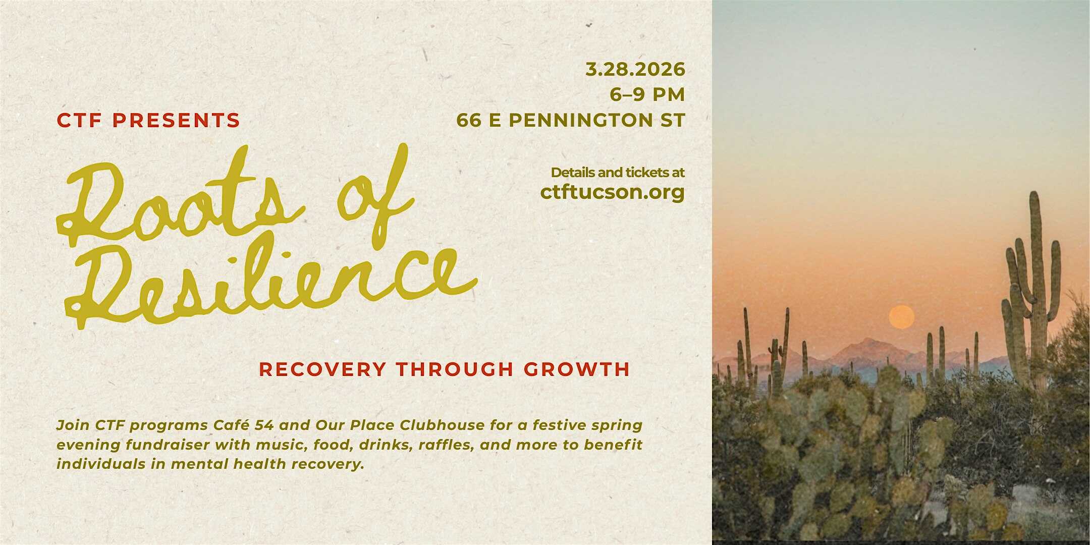 by admin23Feb Roots of Resilience: CTF’s Spring Fundraiser at Café 54 – Tucson, AZ Roots of Resilience: CTF’s Spring Fundraiser at Café 54 – Tucson, AZ 3 3 people viewed this event. CTF’s annual gala and open house benefiting employment and peer support for adults in mental health recovery. Music, food, drinks, and more! Tickets-RSVP Link Date And Time Saturday, March 28th, 2026 @ 06:00 PM Location 54 East Pennington Street, Tucson, AZ 85701 Event Types Charity & CausesParty or Social Gathering Event Category ArizonaTucson Share With Friends Facebook Twitter Linkedin Xing Pinterest Share This Post: