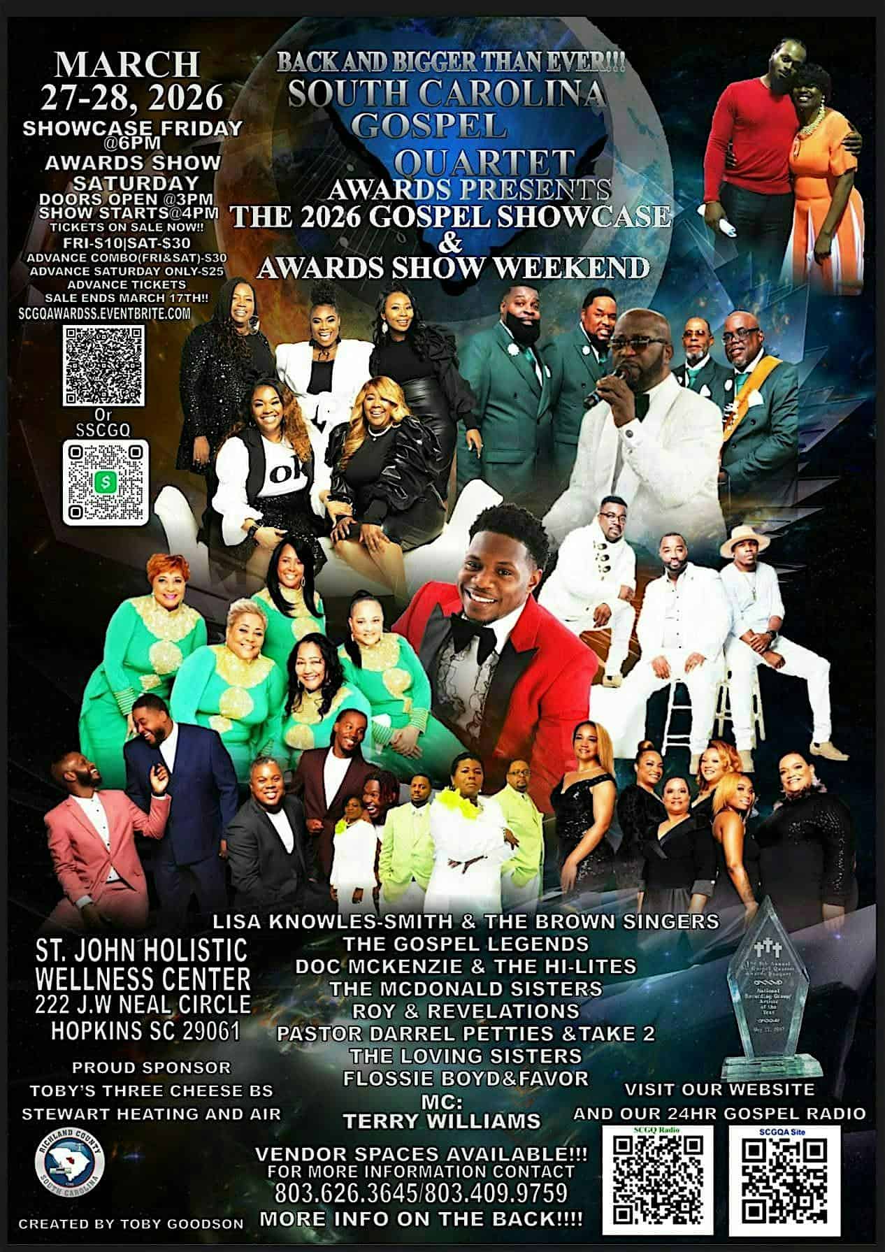 by admin14Feb SCGQ AWARDS GOSPEL SHOW AND SHOWCASE at St John Baptist Church – Hopkins, SC SCGQ AWARDS GOSPEL SHOW AND SHOWCASE at St John Baptist Church – Hopkins, SC 1 1 people viewed this event. FIVE YEARS LATER AND THE STAGE COMES ALIVE AGAIN!!! We are back bigger and better, come and fellow ship with us March 28th. Tickets-RSVP Link Date And Time Saturday, March 28th, 2026 07:00 PM (PST) Venue St John Baptist Church Location 230 Reverend Neal Circle, Hopkins, SC 29061 Event Types Concert or PerformancePerforming & Visual Arts Event Category South Carolina Share With Friends Facebook Twitter Linkedin Xing Pinterest Share This Post: