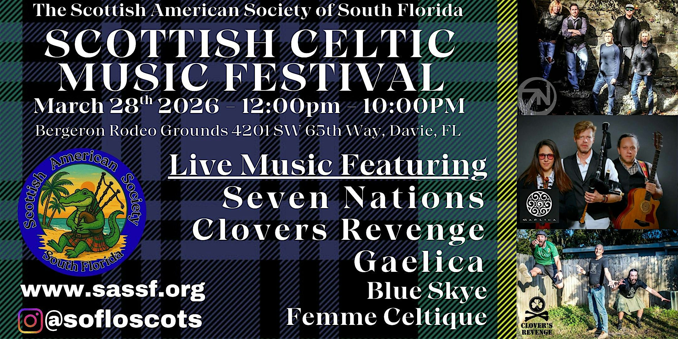 by admin27Feb SE FL Scottish Celtic Music Festival at Bergeron Rodeo Grounds – Davie, FL SE FL Scottish Celtic Music Festival at Bergeron Rodeo Grounds – Davie, FL 1 1 people viewed this event. Join us for a full day of music, heritage, and Highland spirit at the Scottish Celtic Music Festival Tickets-RSVP Link Date And Time Saturday, March 28th, 2026 12:00 PM (PST) Venue Bergeron Rodeo Grounds Location 4201 Southwest 65th Way, Davie, FL 33314 Event Types Festival or FairMusic Event Category FloridaMiami Share With Friends Facebook Twitter Linkedin Xing Pinterest Share This Post:
