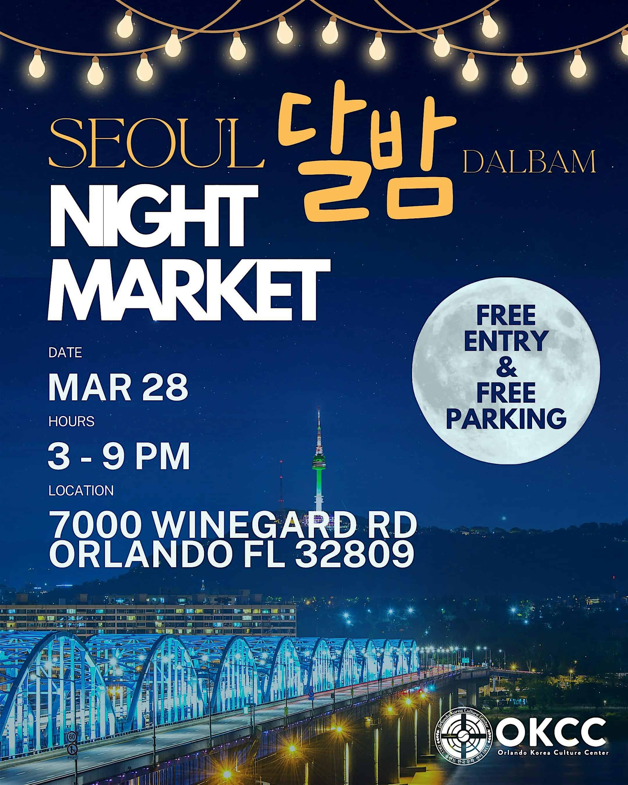 by admin14Feb Seoul Dalbam Night Market at 7000 Winegard Rd – Orlando, FL Seoul Dalbam Night Market at 7000 Winegard Rd – Orlando, FL 1 1 people viewed this event. Enjoy a night of flavor at Seoul Night Market with a wide variety of delicious Asian cuisines from local food vendors! Tickets-RSVP Link Date And Time Saturday, March 28th, 2026 07:00 PM (PST) Venue 7000 Winegard Rd Location 7000 Winegard Road, Orlando, FL 32809 Event Types Festival or FairFood & Drink Event Category FloridaOrlando Share With Friends Facebook Twitter Linkedin Xing Pinterest Share This Post: