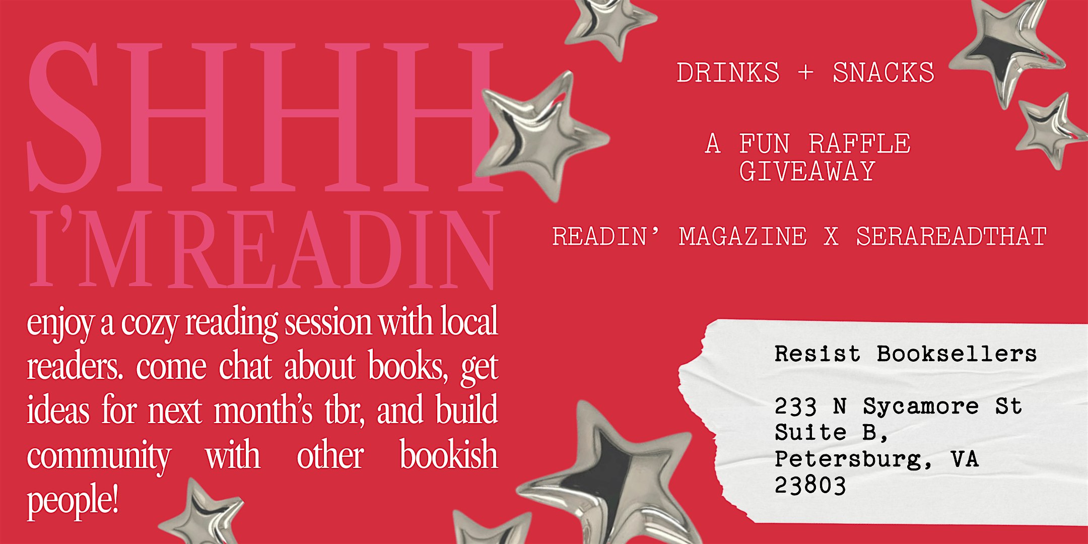 by admin23Feb Shhh, I’m Readin’ at Resist Booksellers Bookstore – Petersburg, VA Shhh, I’m Readin’ at Resist Booksellers Bookstore – Petersburg, VA 1 1 people viewed this event. Silent Readin’ Event put on by Readin’ Magazine + Sera (@serareadthat) at Resist Booksellers Tickets-RSVP Link Date And Time Saturday, March 28th, 2026 12:00 PM (PST) Venue Resist Booksellers Bookstore Location 233 North Sycamore Street, Petersburg, VA 23803 Event Types Community & CultureParty or Social Gathering Event Category Virginia Share With Friends Facebook Twitter Linkedin Xing Pinterest Share This Post: