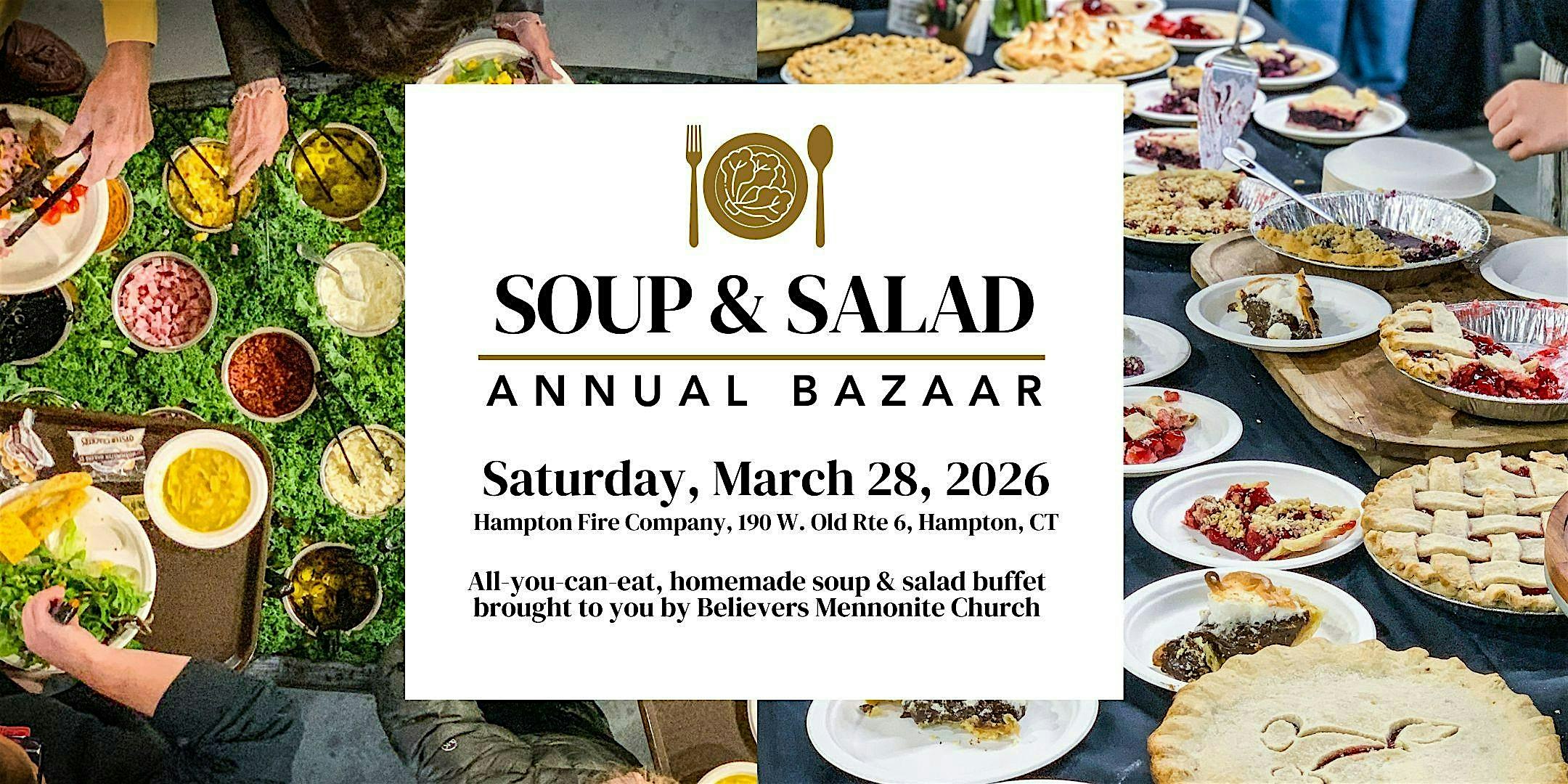 by admin24Feb Soup & Salad Bazaar: Sat. March 28th at Hampton Fire Department – Hampton, CT Soup & Salad Bazaar: Sat. March 28th at Hampton Fire Department – Hampton, CT 1 1 people viewed this event. Homemade, all-you-can-eat, soup & salad buffet on Sat. March 28th; Reserved Seating Time Slots & General Admission Tickets-RSVP Link Date And Time Saturday, March 28th, 2026 01:00 PM (PST) Venue Hampton Fire Department Location 190 West Old Route 6, Hampton, CT 6247 Event Types Food & Drink Event Category Connecticut Share With Friends Facebook Twitter Linkedin Xing Pinterest Share This Post: