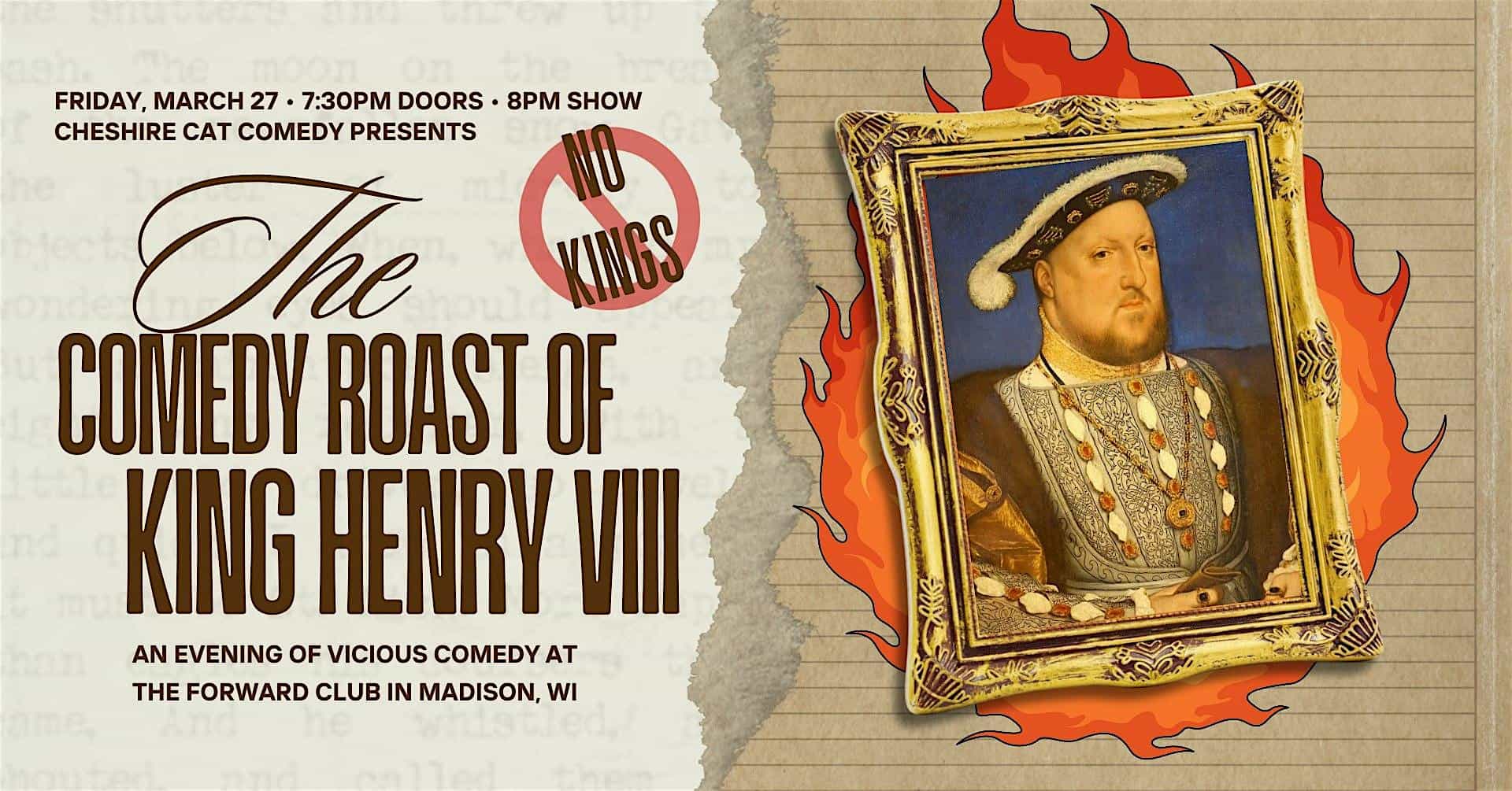 by admin14Feb The Comedy Roast of King Henry VIII at Forward Madison FC – Madison, WI The Comedy Roast of King Henry VIII at Forward Madison FC – Madison, WI 1 1 people viewed this event. Join us for the comedy roast of serial “monogamist” and former King of England Henry VIII. Tickets-RSVP Link Date And Time Saturday, March 28th, 2026 01:00 AM (PST) Venue Forward Madison FC Location 917 East Mifflin Street, Madison, WI 53704 Event Types Concert or PerformancePerforming & Visual Arts Event Category Wisconsin Share With Friends Facebook Twitter Linkedin Xing Pinterest Share This Post: