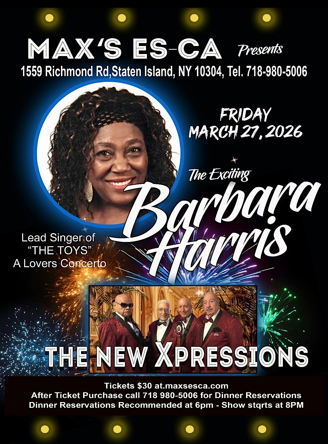 by admin13Feb The New Xpressions and Barbara Harris at Max’s Es-ca – Staten Island, NY The New Xpressions and Barbara Harris at Max’s Es-ca – Staten Island, NY 1 1 people viewed this event. Join us for an unforgettable evening of delicious dining paired with live music. Tickets-RSVP Link Date And Time Saturday, March 28th, 2026 12:00 AM (PST) Venue Max's Es-ca Location 1559 Richmond Road, Staten Island, NY 10304 Event Types Food & DrinkParty or Social Gathering Event Category New York Share With Friends Facebook Twitter Linkedin Xing Pinterest Share This Post: