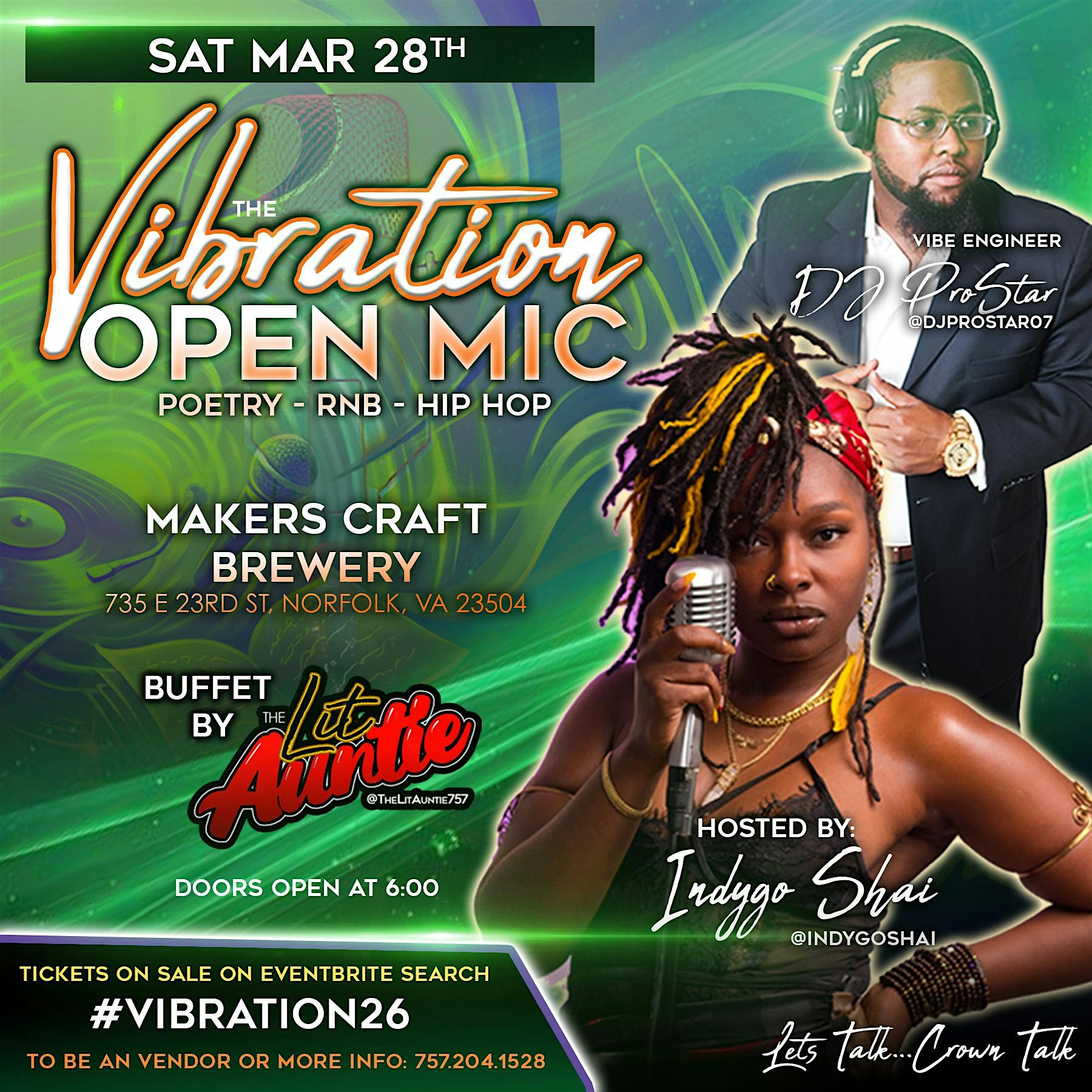 The Vibrations | Poetry Open Mic Night #Vibrations26 at Maker’s Craft Brewery – Norfolk, VA The Vibrations | Poetry Open Mic Night #Vibrations26 at Maker’s Craft Brewery – Norfolk, VA 3 3 people viewed this event. Come Vibe Out with Indygo Shai, DJ ProStar, The Lit Auntie Tickets-RSVP Link Register for event Date And Time Saturday, March 28th, 2026 @ 06:00 PM Location 735 East 23rd Street, Norfolk, VA 23504 Event Types Concert or PerformancePerforming & Visual Arts Event Category NorfolkVirginia Share With Friends Facebook Twitter Linkedin Xing Pinterest
