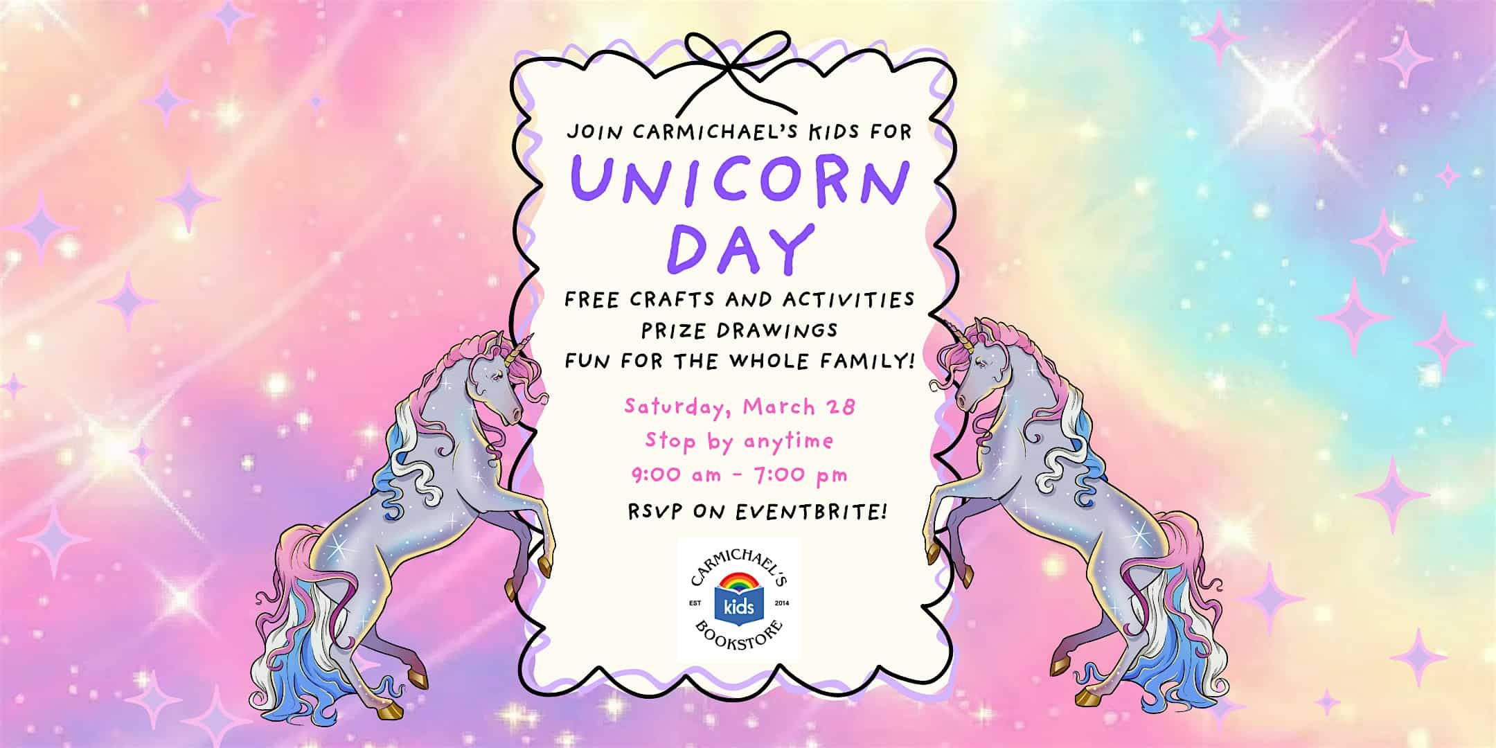 by admin23Feb Unicorn Day @ Carmichael’s Kids at 1313 Bardstown Rd – Louisville, KY Unicorn Day @ Carmichael’s Kids at 1313 Bardstown Rd – Louisville, KY 2 2 people viewed this event. Join Carmichael’s Kids for Unicorn Day on Saturday, March 28. Stop by anytime between 9am-7pm for free crafts, games, and giveaways. Tickets-RSVP Link Date And Time Saturday, March 28th, 2026 09:00 AM (PST) Venue 1313 Bardstown Rd Location 1313 Bardstown Road, Louisville, KY 40204 Event Types Party or Social Gathering Event Category KentuckyLouisville Share With Friends Facebook Twitter Linkedin Xing Pinterest Share This Post: