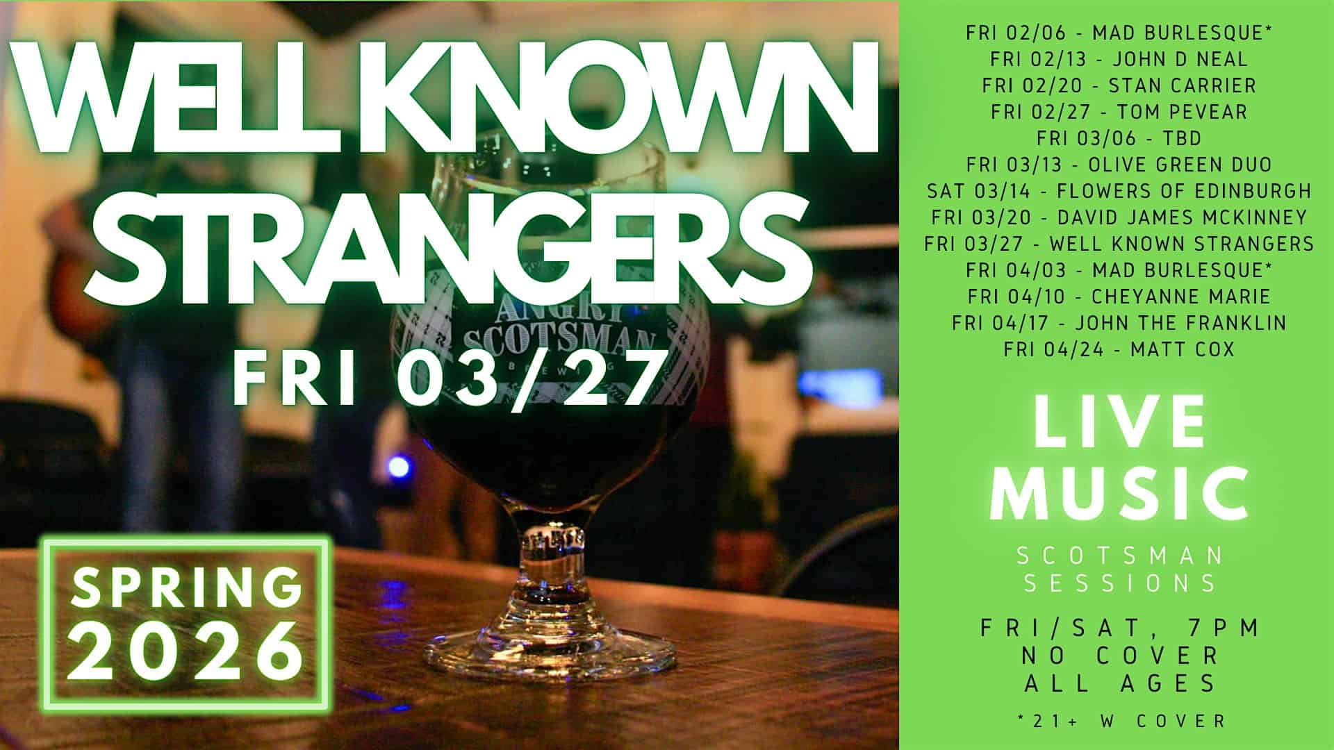by admin14Feb Well Known Strangers Live Performance at Angry Scotsman Brewing at Angry Scotsman Brewing – Oklahoma City, OK Well Known Strangers Live Performance at Angry Scotsman Brewing at Angry Scotsman Brewing – Oklahoma City, OK 1 1 people viewed this event. Well Known Strangers are a popular local cover band known for high-energy rock, playing hits from the ’70s to ’90s. Tickets-RSVP Link Date And Time Saturday, March 28th, 2026 12:00 AM (PST) Venue Angry Scotsman Brewing Location 704 West Reno Avenue, Oklahoma City, OK 73102 Event Types Concert or PerformancePerforming & Visual Arts Event Category OklahomaOklahoma City Share With Friends Facebook Twitter Linkedin Xing Pinterest Share This Post: