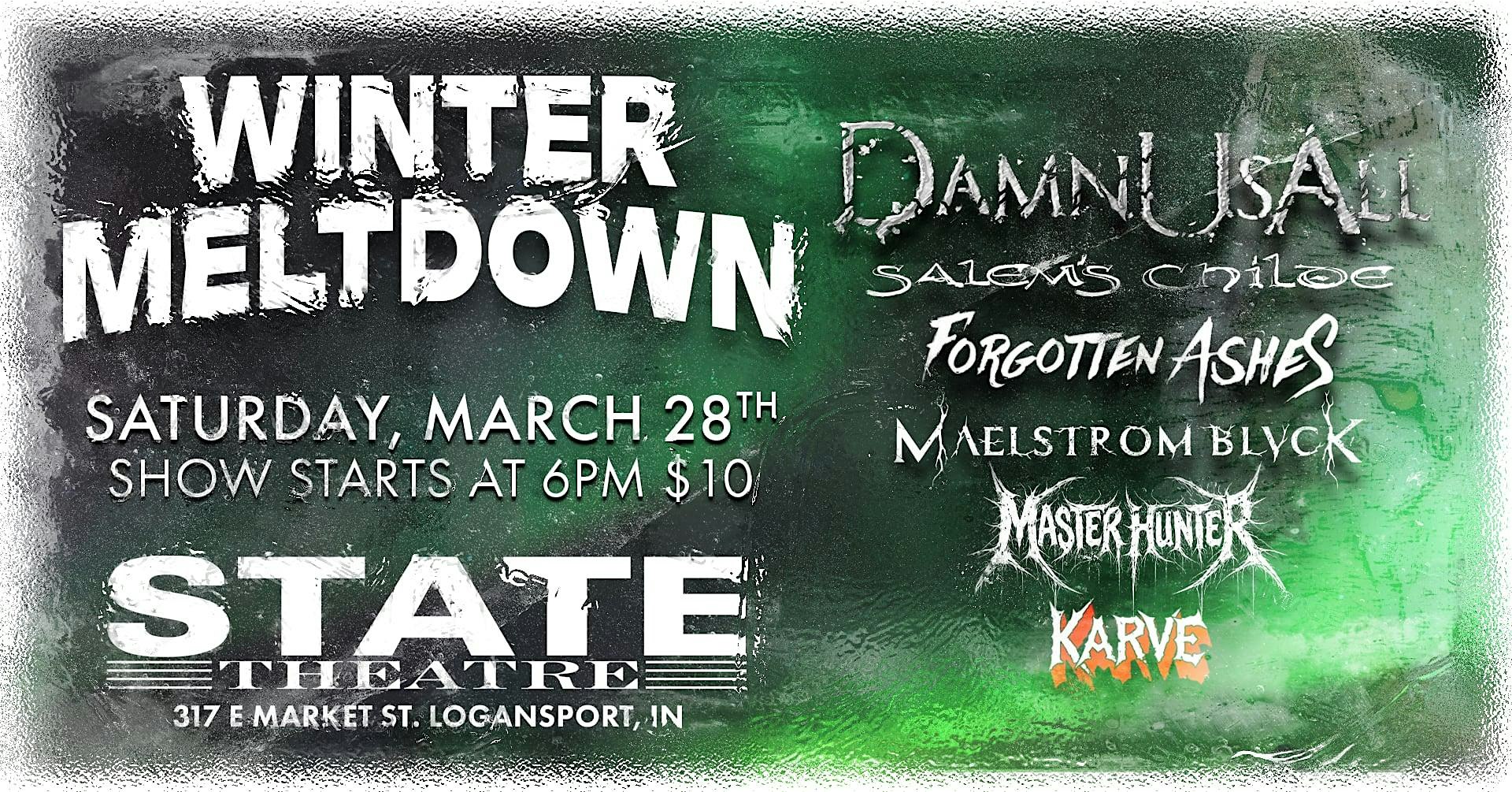 by admin13Feb Winter Meltdown at The State Theatre – Logansport, IN Winter Meltdown at The State Theatre – Logansport, IN 3 3 people viewed this event. The raw thunder of Indiana metal is coming to melt away the winter at the State Theatre. Tickets-RSVP Link Date And Time Saturday, March 28th, 2026 10:00 PM (PST) Venue The State Theatre Location 317 E Market St, Logansport, IN 46947 Event Types Concert or PerformanceMusic Event Category Indiana Share With Friends Facebook Twitter Linkedin Xing Pinterest Share This Post: