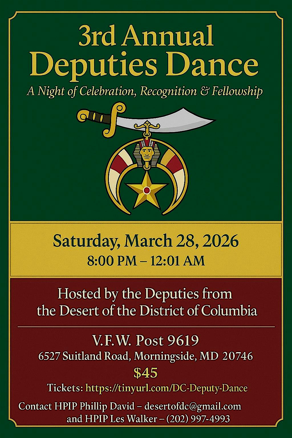 by admin13Feb 3rd Annual Desert of the District of Columbia Deputies Dance at V. F. W. Post 9619 – Morningside, MD 3rd Annual Desert of the District of Columbia Deputies Dance at V. F. W. Post 9619 – Morningside, MD 2 2 people viewed this event. General Tickets: $45 / Early Bird Tickets: $40 (First 50) Tickets-RSVP Link Date And Time Sunday, March 29th, 2026 12:00 AM (PST) Venue V. F. W. Post 9619 Location 6527 Suitland Road, Morningside, MD 20746 Event Types Food & DrinkParty or Social Gathering Event Category Maryland Share With Friends Facebook Twitter Linkedin Xing Pinterest Share This Post: