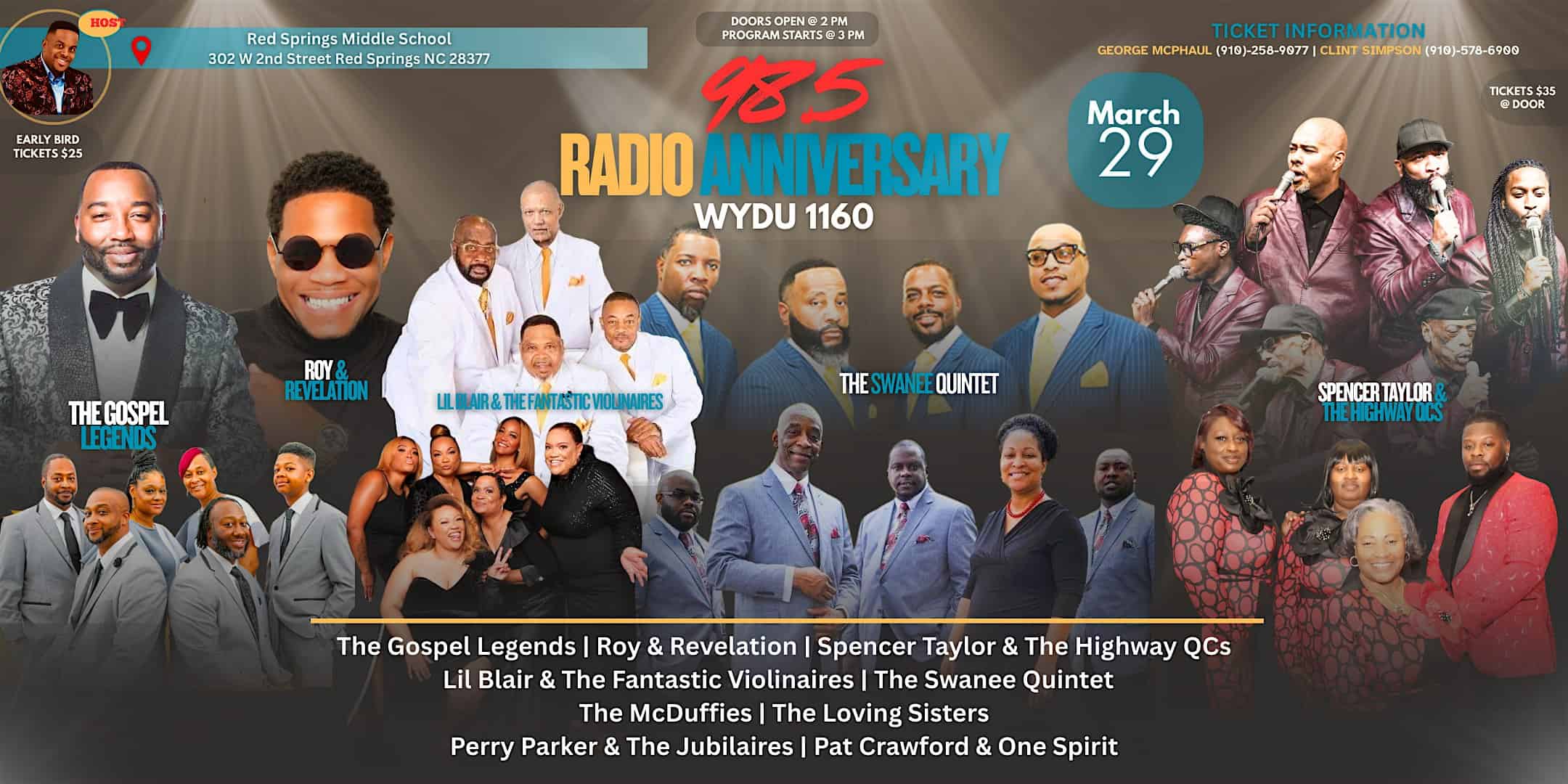 by admin14Feb 98.5 FM Anniversary at Red Springs Middle School – Red Springs, NC 98.5 FM Anniversary at Red Springs Middle School – Red Springs, NC 1 1 people viewed this event. Celebrate 98.5 FM’s anniversary with live music, prizes, and in-person fun. Don’t miss it! Tickets-RSVP Link Date And Time Sunday, March 29th, 2026 07:00 PM (PST) Venue Red Springs Middle School Location 302 West 2nd Avenue, Red Springs, NC 28377 Event Types Concert or Performance Event Category North Carolina Share With Friends Facebook Twitter Linkedin Xing Pinterest Share This Post: