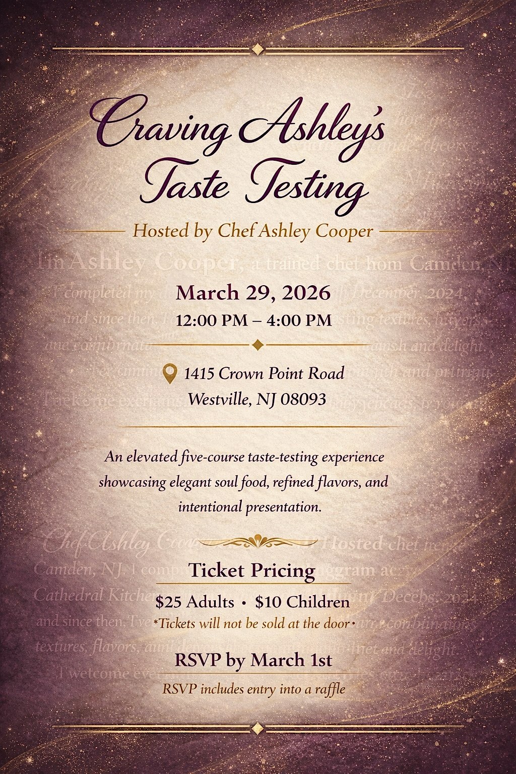 by admin24Feb Craving Ashley’s Taste Testing at 1415 Crown Point Rd – Westville, NJ Craving Ashley’s Taste Testing at 1415 Crown Point Rd – Westville, NJ 1 1 people viewed this event. Join us for Craving Ashley’s Taste Testing and dive into delicious bites you won’t want to miss! Tickets-RSVP Link Date And Time Sunday, March 29th, 2026 @ 01:00 PM Location 1415 Crown Point Road, Westville, NJ 8093 Event Types Food & DrinkOther Event Category New Jersey Share With Friends Facebook Twitter Linkedin Xing Pinterest Share This Post: